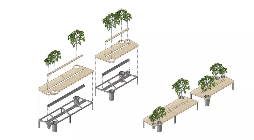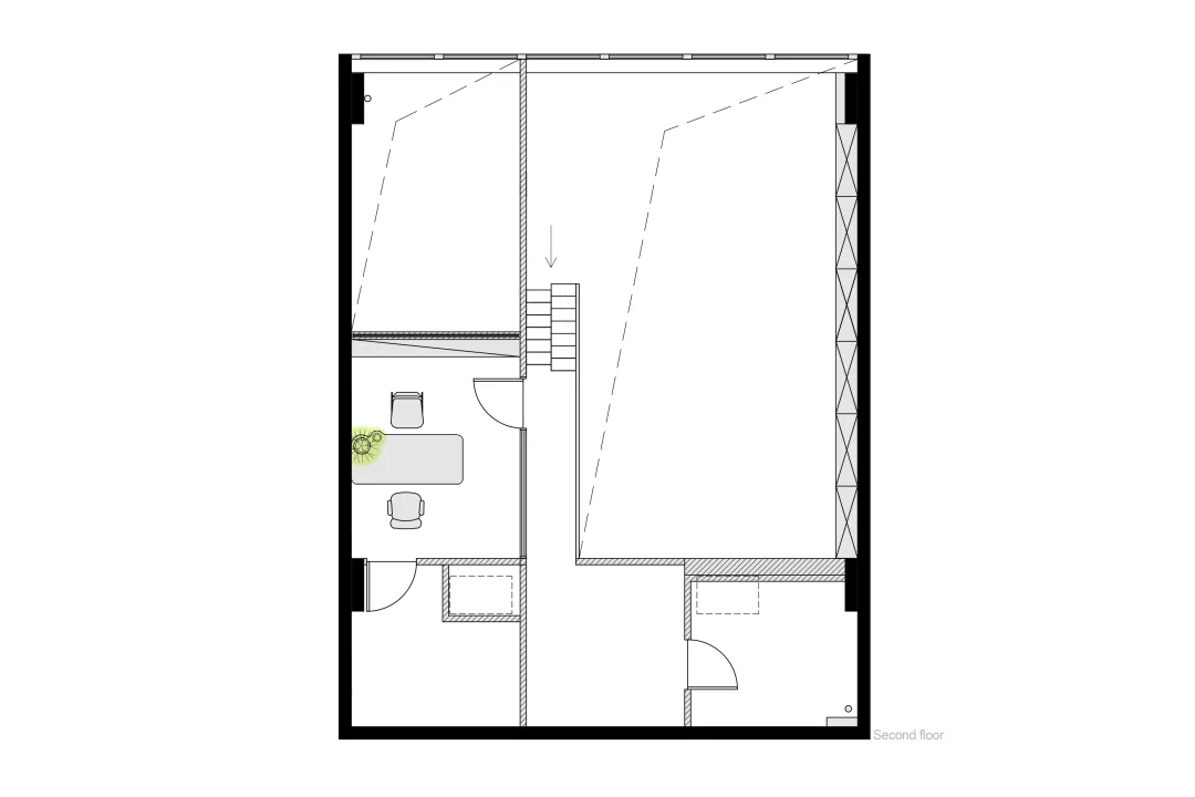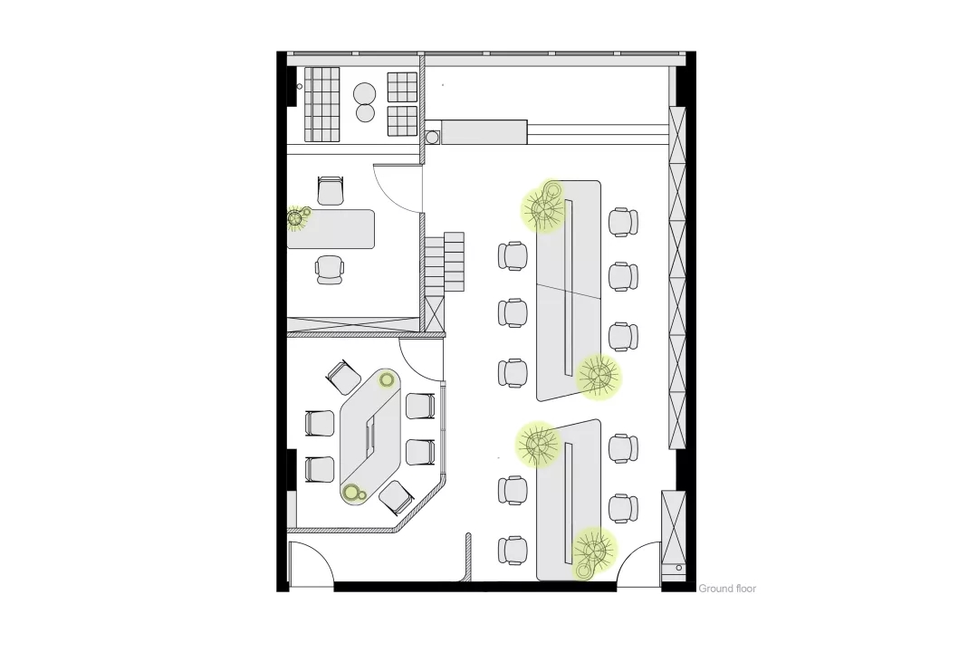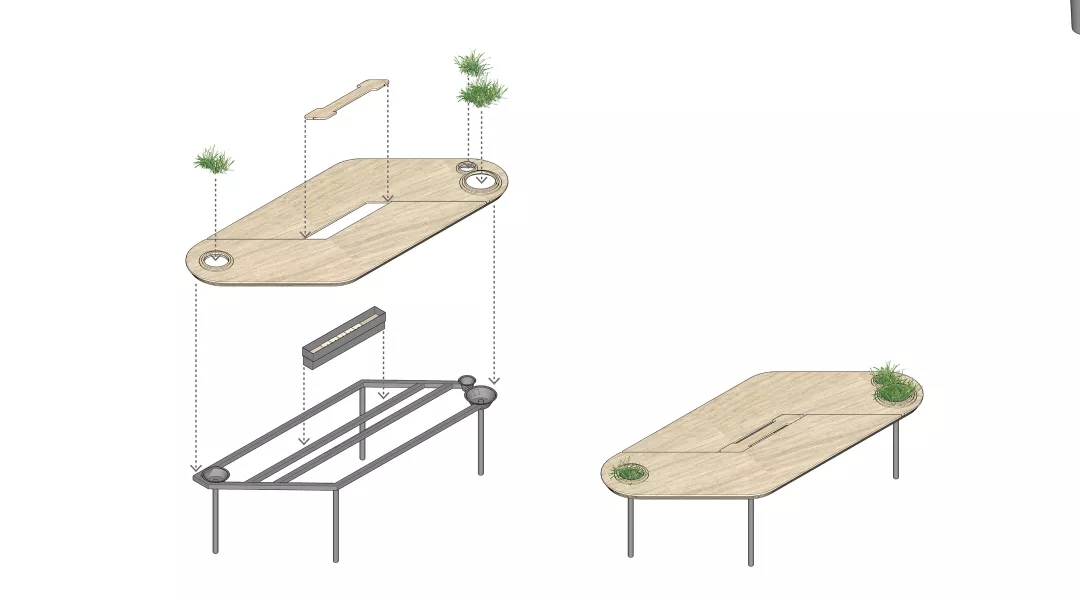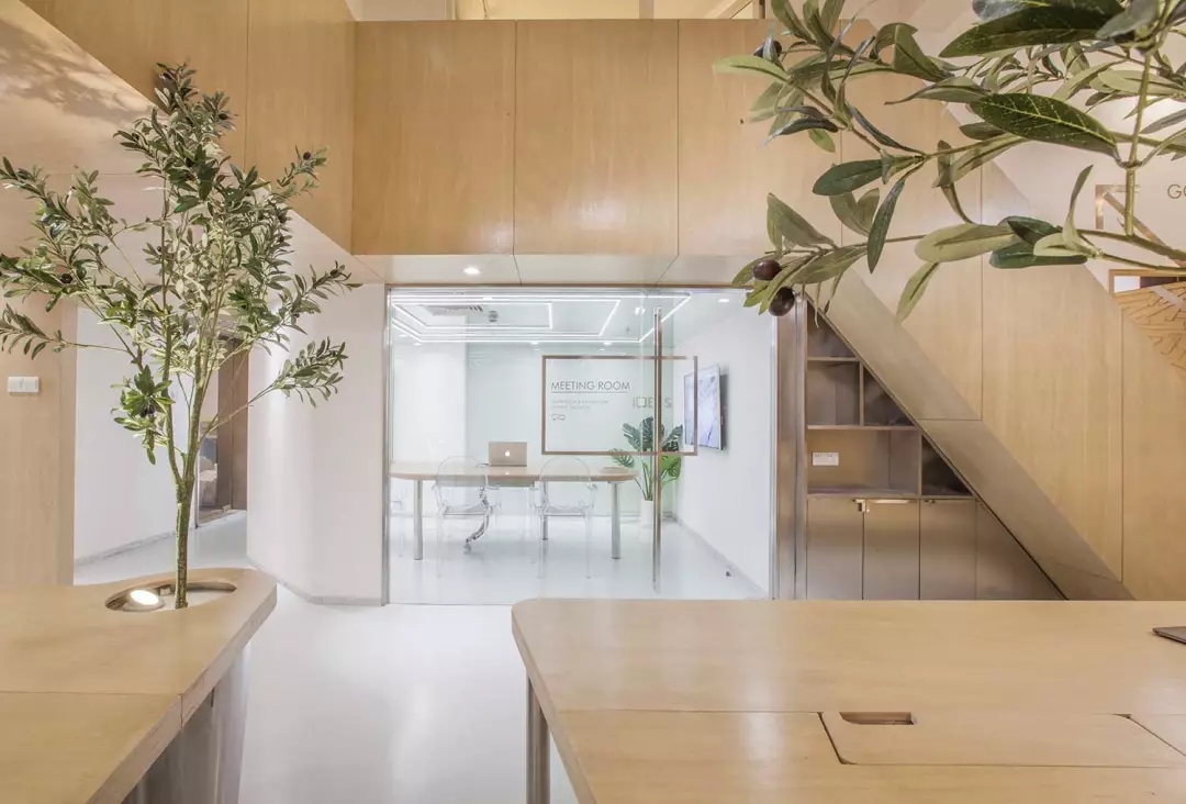 同時我們希望有一個張別具一格的會議桌,但是會議桌極強(qiáng)的功能性使得難以去進(jìn)行改變。于是,會議室空間本身的形狀缺陷成了這張桌子想法的起點(diǎn)。由于避讓入口玄關(guān),會議室空間有一個角是切掉的,墻壁是斜著放置,如果是長方形的會議桌,就必然在這個斜墻前造成使用空間不夠缺陷,無法坐人.所以就產(chǎn)生了一個平行四邊形的會議桌,斜邊與空間的斜墻平行,也讓整個斜墻前的空間可以坐下一個參會者,再嵌入一些小草,一張獨(dú)特又實(shí)用的會議桌就出來了。
