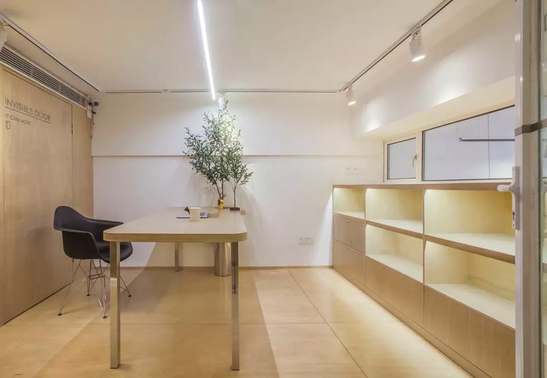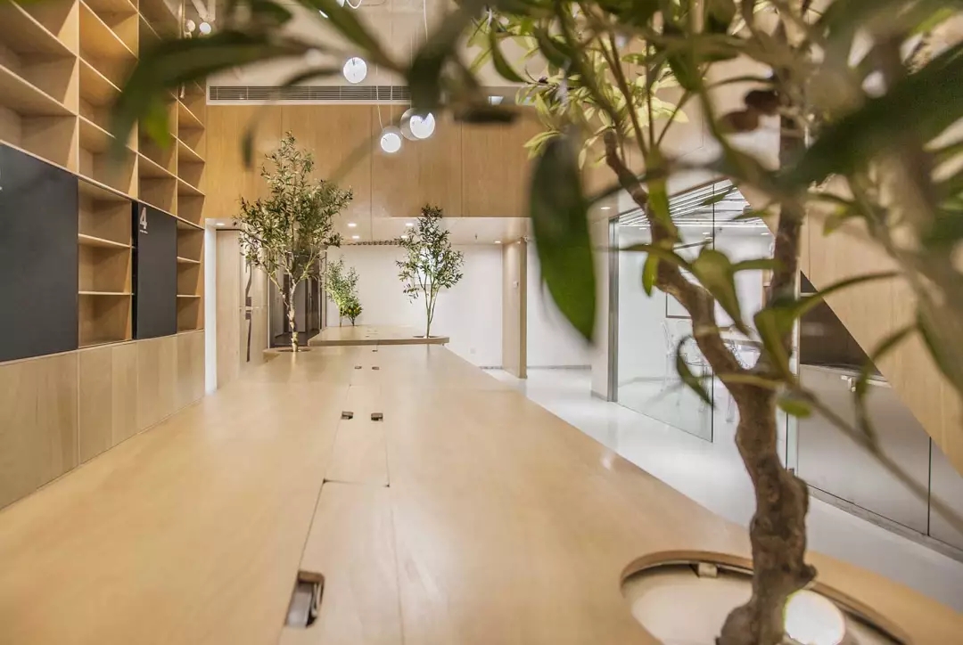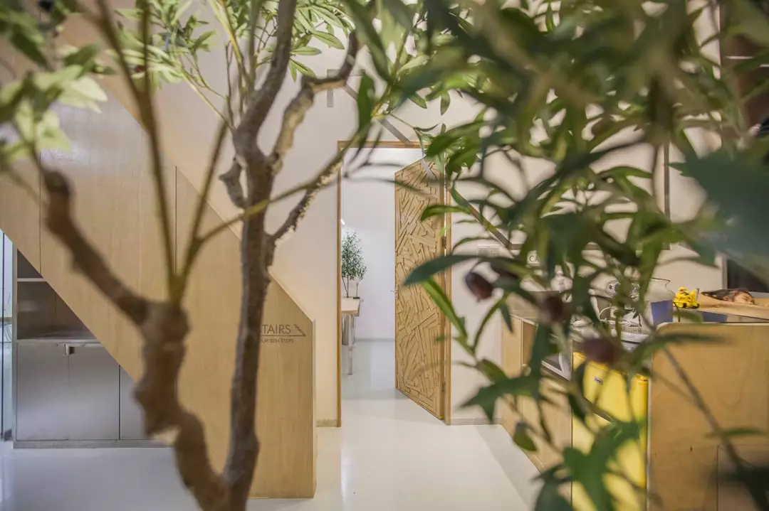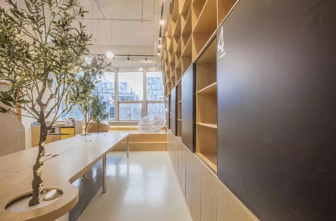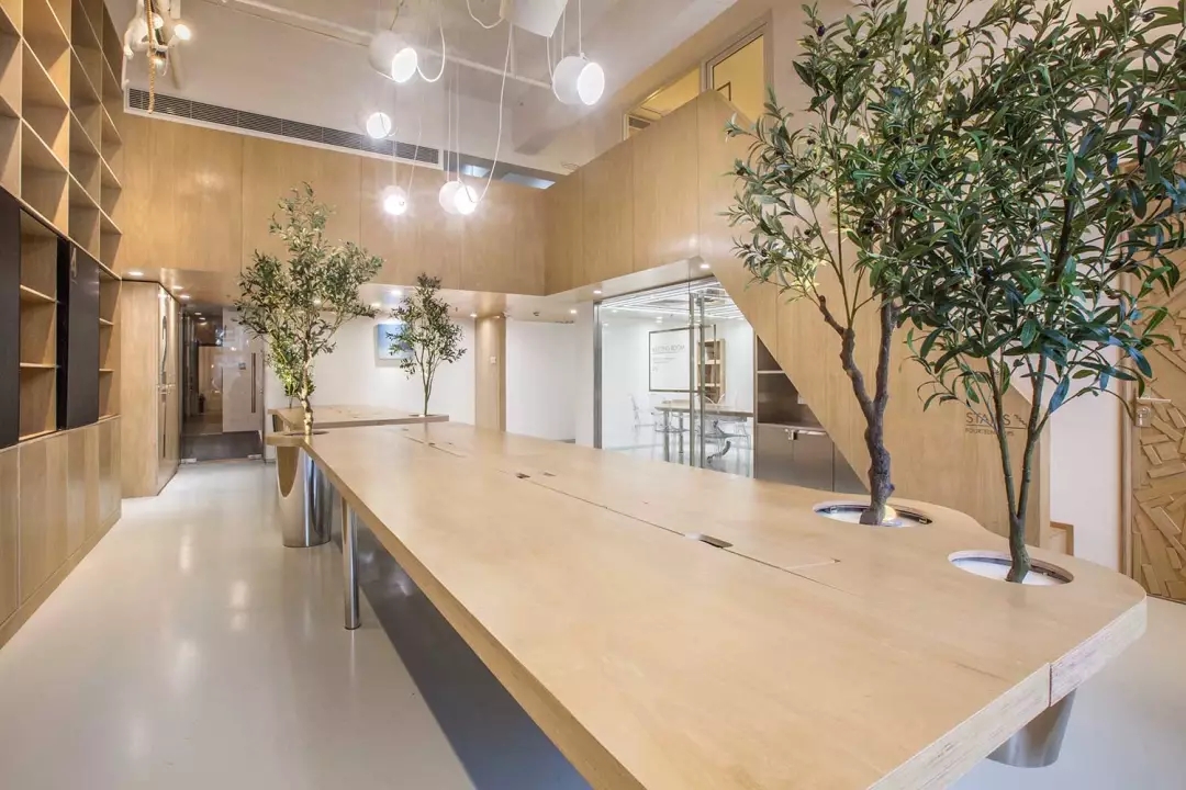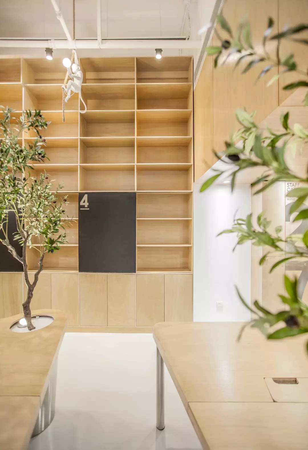 辦公桌與樹的結(jié)合,成為了整個空間的內(nèi)景觀,也與外面的綠色形成呼應(yīng),消減以往辦公的緊張氛圍。整墻的書架也不甘無趣,在實(shí)用的框架下,產(chǎn)生一絲波動的起伏,如同山崖,如同坡面。