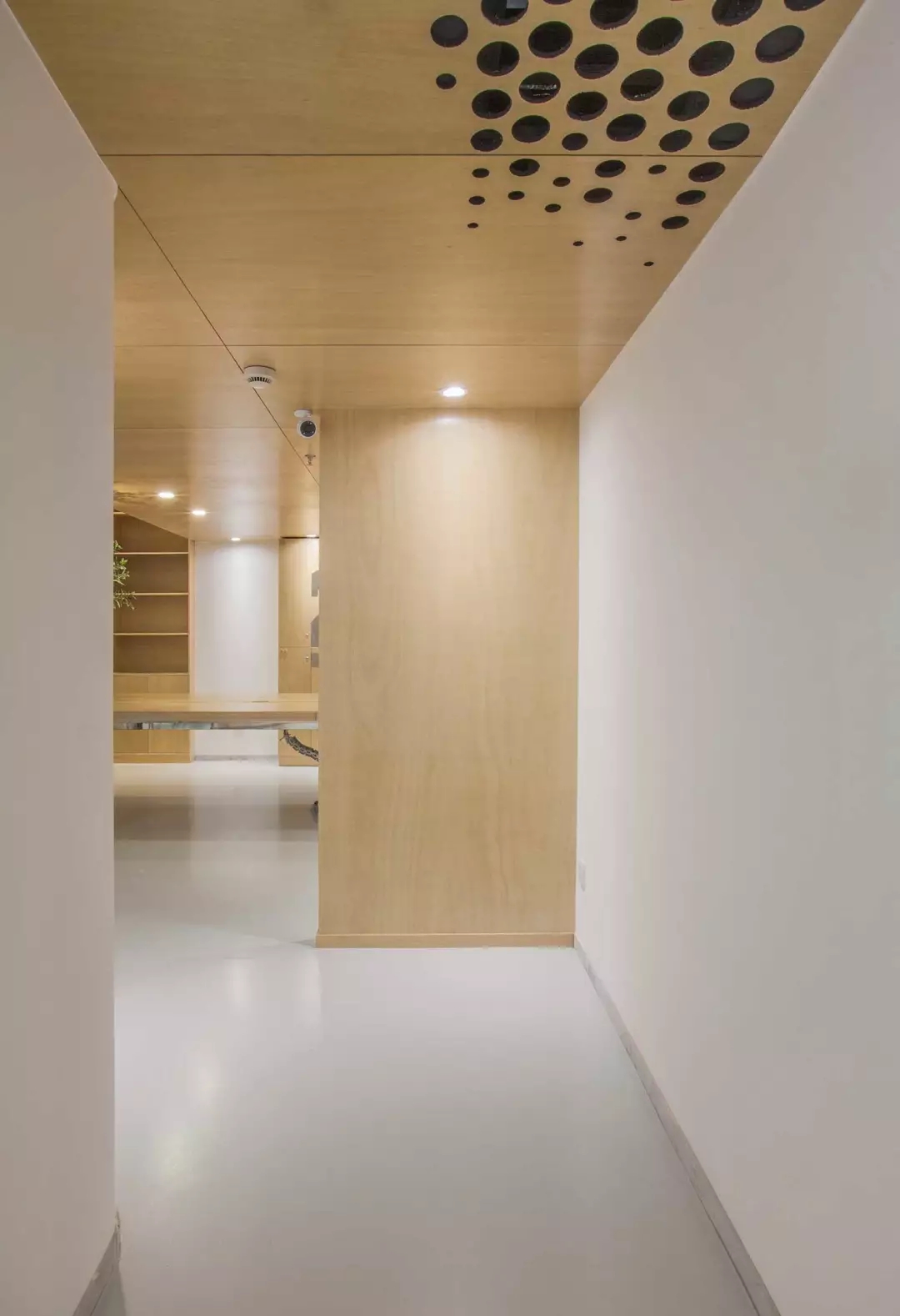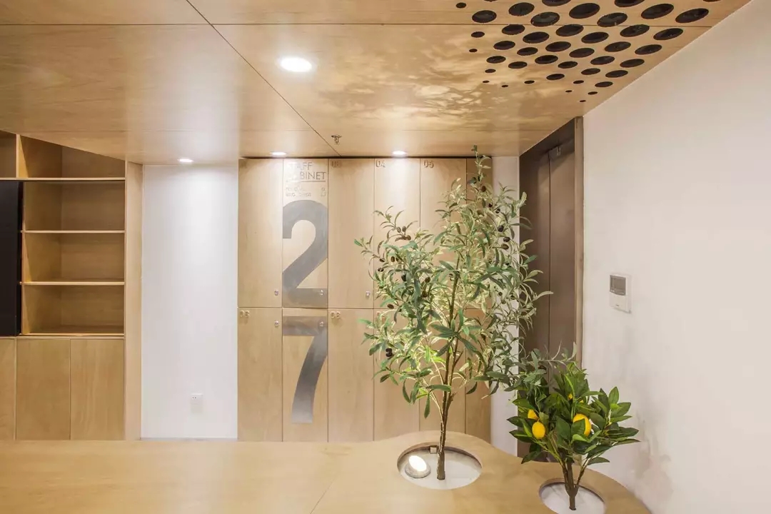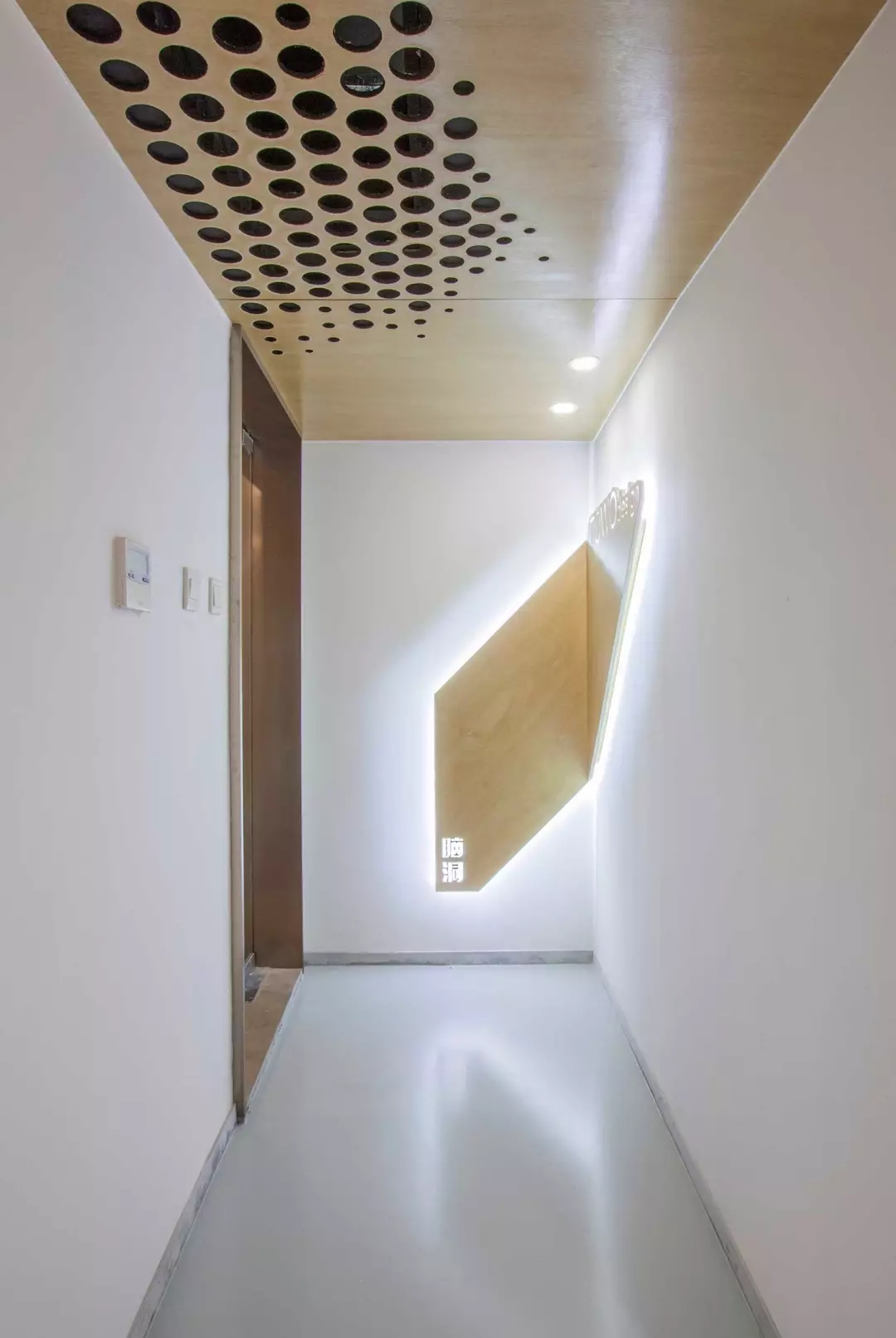 功能融于樂趣與創(chuàng)意,兩個空調(diào)的回風(fēng)孔也不能放過,市面上的百葉口為了實(shí)用而完全無法融入環(huán)境。由于吊頂也屬于木質(zhì)體塊,所以經(jīng)過試驗(yàn),一個充滿漸變的點(diǎn)陣圖形,解決了這個問題,不同規(guī)格的開孔器進(jìn)過精心布置并開洞,讓空間回歸純粹與樂趣。