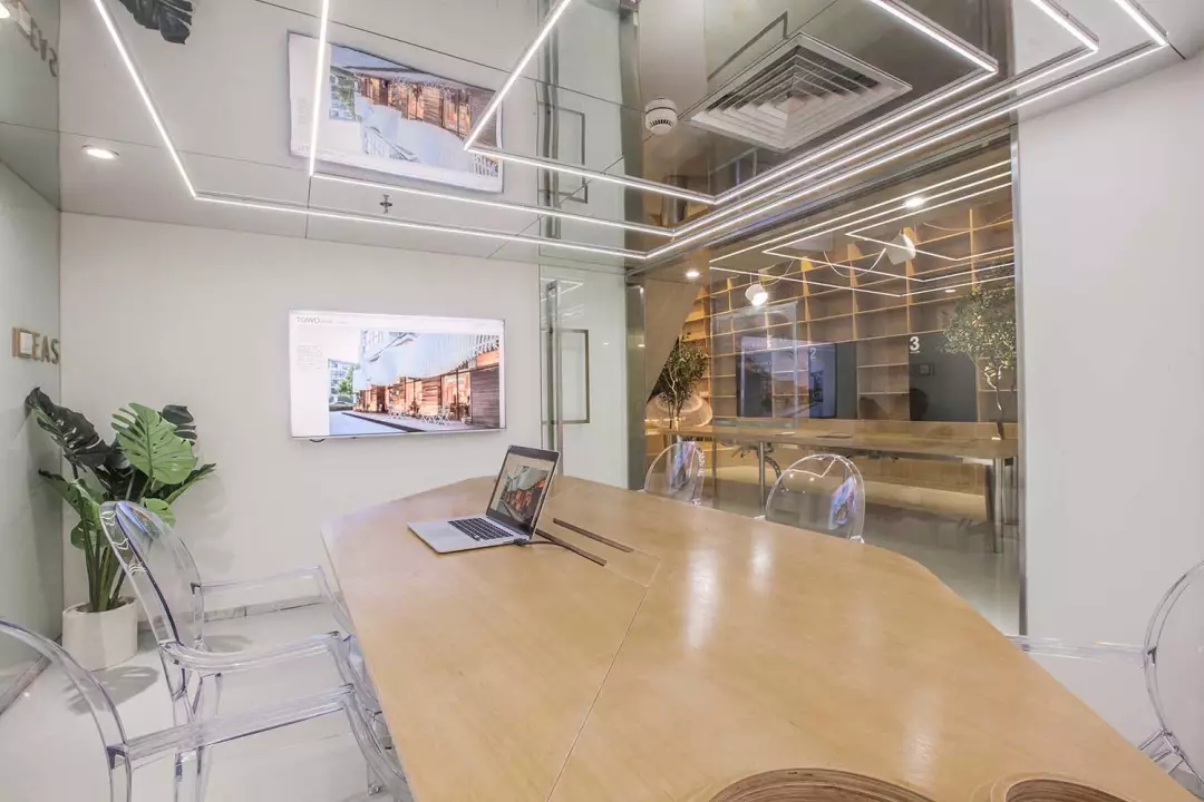 由于層高的限制,會議室感覺比較壓抑,所以將整個天花變?yōu)殓R面,化解的層高的局限,也讓空間感別具一格.但是空調(diào)的出風(fēng)散流器非常扎眼,空調(diào)的位置決定了風(fēng)口位置無法移動。而市面上又找不來合適的可以符號化的替代品,于是,就順勢而為,將會議室的照明以散流器為中心進(jìn)行布置,讓散流器的方框與燈光呼應(yīng)起來,形成了會議室有意思的圖形。