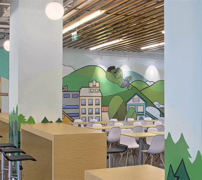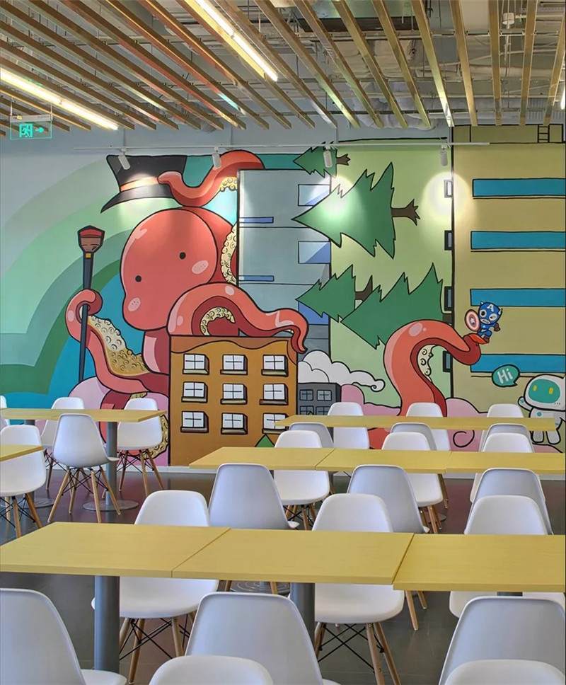 空間氛圍不同,所以圖形裝飾也會(huì)因地制宜的改變,用暖色更動(dòng)態(tài)的感覺(jué)。繪制的粉筆畫,可以定期的更換,像黑板報(bào)一樣制定不同的主題,它就是一面活的展示墻。