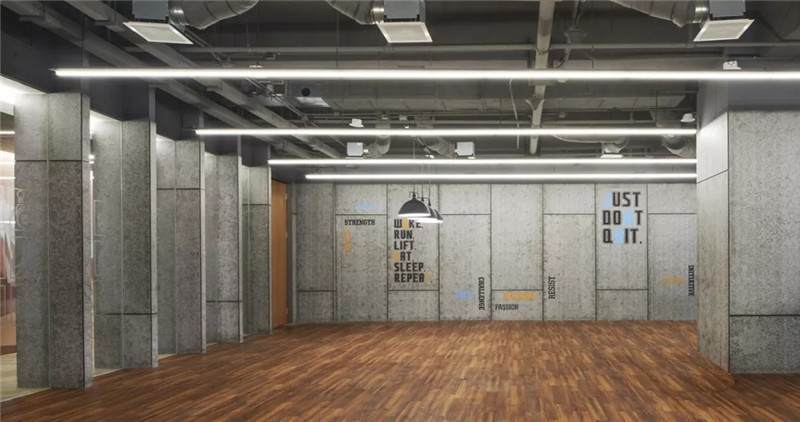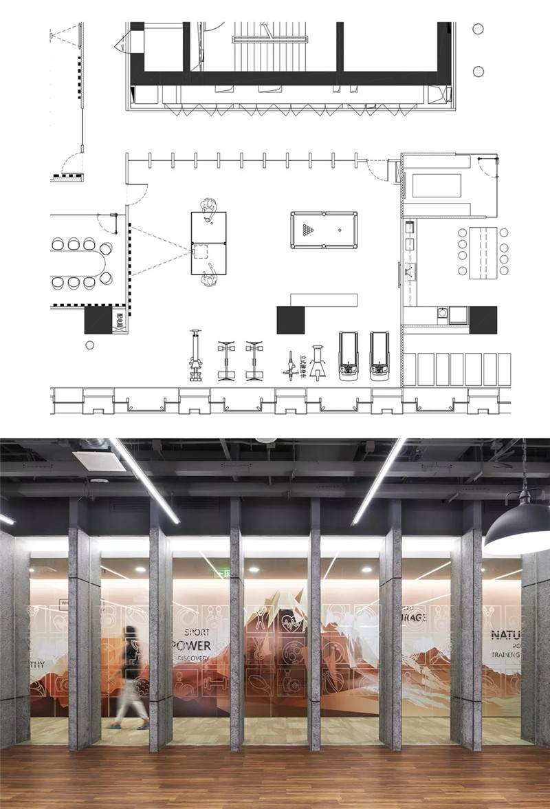 健身房采用的是隔墻類的隔斷,透過(guò)隔墻隔斷玻璃能看到核心筒的走道,核心筒的墻面是一幅大型的噴繪畫,結(jié)合立體字,畫面比較震撼,再通過(guò)健身房往外看就會(huì)產(chǎn)生非常豐富的層次感。玻璃隔斷上也有小的磨砂圖案,形成了戲劇性的效果,使空間的層次更加突出。