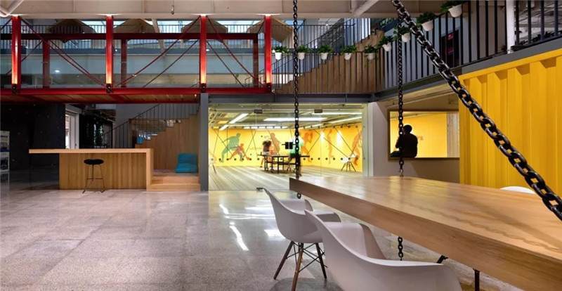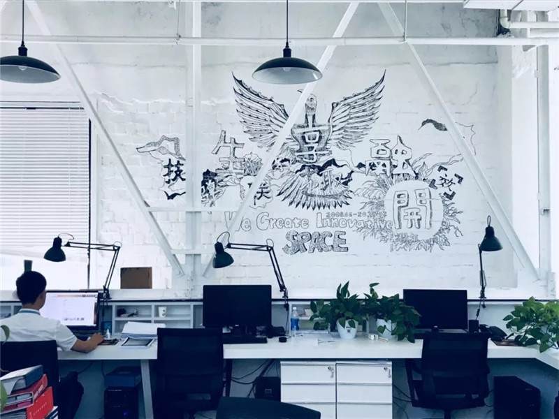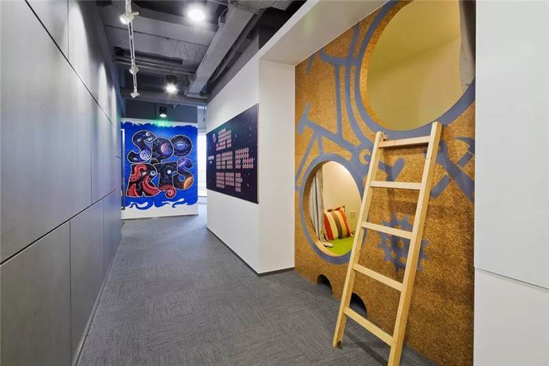 比如這張圖,也是華米科技北京的辦公室,用奧松板開兩個(gè)洞,精巧可愛(ài)的睡眠艙趴在墻上,利用兩個(gè)洞把它組成了自行車的輪廓,超萌的壁畫使墻面不再單一,色彩的對(duì)比更加直觀,同時(shí)用太空艙的形式增添趣味點(diǎn),不論是做設(shè)計(jì)師還是做工匠,都要秉持設(shè)計(jì)的理念去進(jìn)行選材和制造工藝,把握好每一個(gè)細(xì)節(jié)。