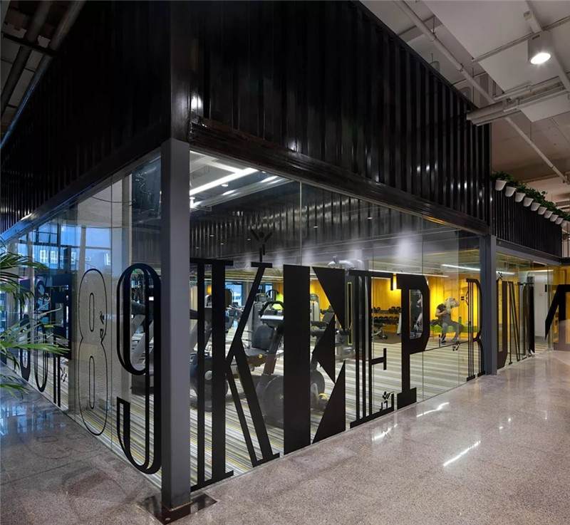 整體空間設(shè)計(jì)多層次,所以它的貼膜采用黑色字母來(lái)呈現(xiàn)健身區(qū)的氛圍。