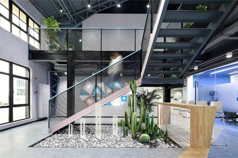 前廳左側(cè),設(shè)計(jì)結(jié)構(gòu)簡單的樓梯,運(yùn)用與二層欄桿材質(zhì)相同的鐵絲網(wǎng)扶手,使得兩層樓形成一個工業(yè)風(fēng)的整體。側(cè)邊與扶手點(diǎn)綴以藍(lán)色和粉色的噴漆,樓梯下布置用鵝卵石,仙人掌和燈光組成的景觀裝置小品,讓整個電競空間生機(jī)勃勃,平添許多年輕活躍的氛圍。此處木飾面的吧臺延伸到地面再與前臺、右側(cè)大臺階連接形成一個整體,使整個空間更加連貫統(tǒng)一。