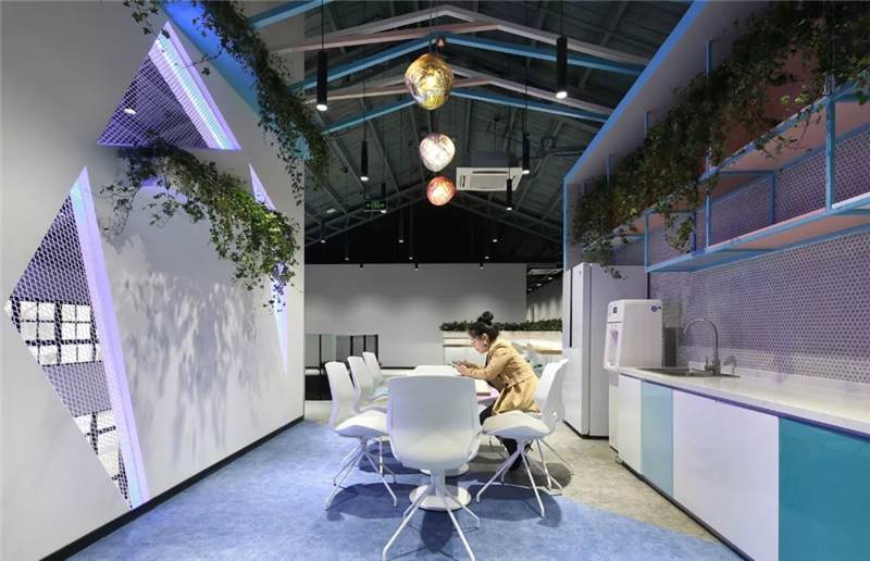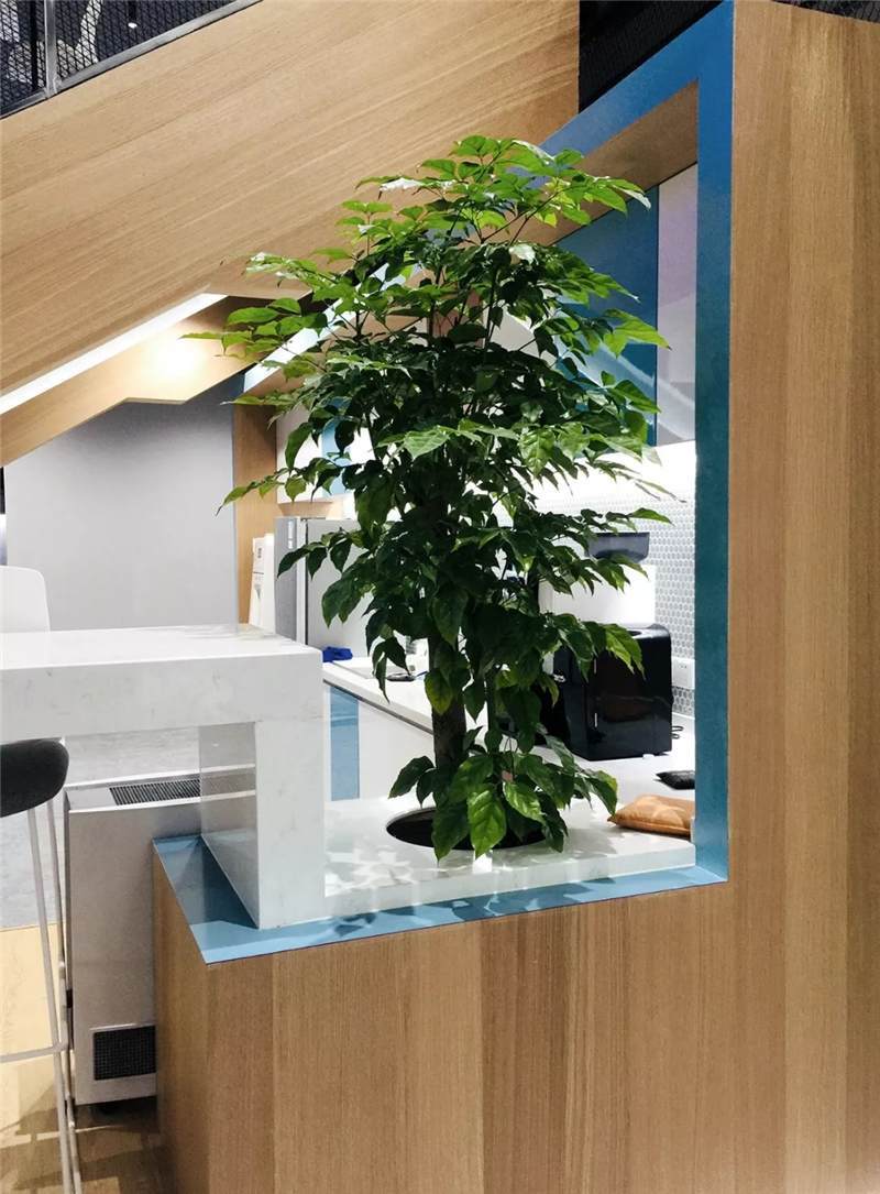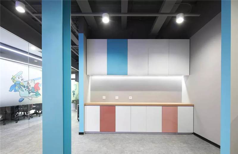 吊柜打破了傳統(tǒng)的平開門形式,使用開放的彩色盒子,實(shí)用兼裝飾功能。另外設(shè)計(jì)師還根據(jù)層高差,在茶水區(qū)頂部設(shè)計(jì)三角形格柵,茶水柜上方及背景墻后方,點(diǎn)綴綠植,使整個空間富有生態(tài)氣息,在光影的效果呈現(xiàn)別樣風(fēng)采。