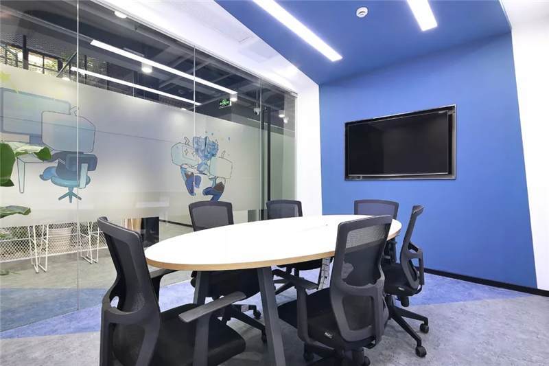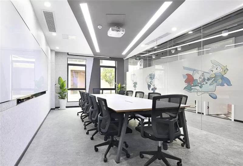 開放辦公區(qū)主體用大量的白色,更加干凈、簡潔;頂面燈具使用粉色,與其他區(qū)域相呼應(yīng);地面采用兩種地膠拼接,也使得空間更加有層次感。大小不同的會議空間設(shè)計(jì),運(yùn)用了天花到墻面再到地面的連貫造型,增加整個會議空間的靈活性。