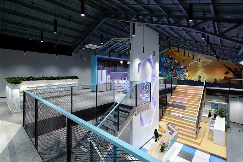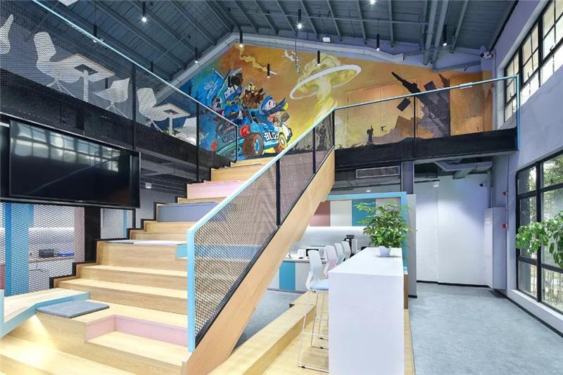 二層大臺階入口處設(shè)計(jì)師設(shè)置醒目的電競主題手繪圖,巧妙的把原本的雙開門變成隱形門,墻內(nèi)部為電競導(dǎo)播室。手繪圖豐富的色彩,突出的電競主題,卡通的形象,把BILIBILI的風(fēng)格呈現(xiàn)的淋漓盡致。
