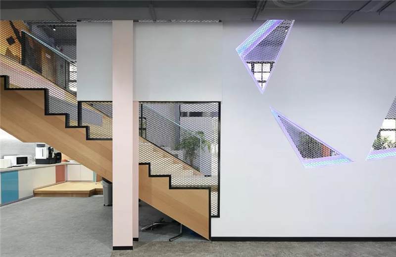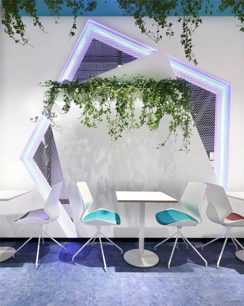 前臺接待區(qū)利用建筑結(jié)構(gòu)挑空空間的優(yōu)勢,塑造9米高的具有未來雕塑造型藝術(shù)感的LOGO背景墻,結(jié)構(gòu)形態(tài)上,設(shè)計(jì)師運(yùn)用B站文化中的創(chuàng)意與元素,中間由三維立體幾何造型與鐵絲網(wǎng)拼接而成,配以藍(lán)色燈光,彰顯公司文化的同時呈現(xiàn)電競的科技感,使得整體背景墻,體量和形態(tài)上給往來訪客和員工強(qiáng)烈的視覺沖擊感。