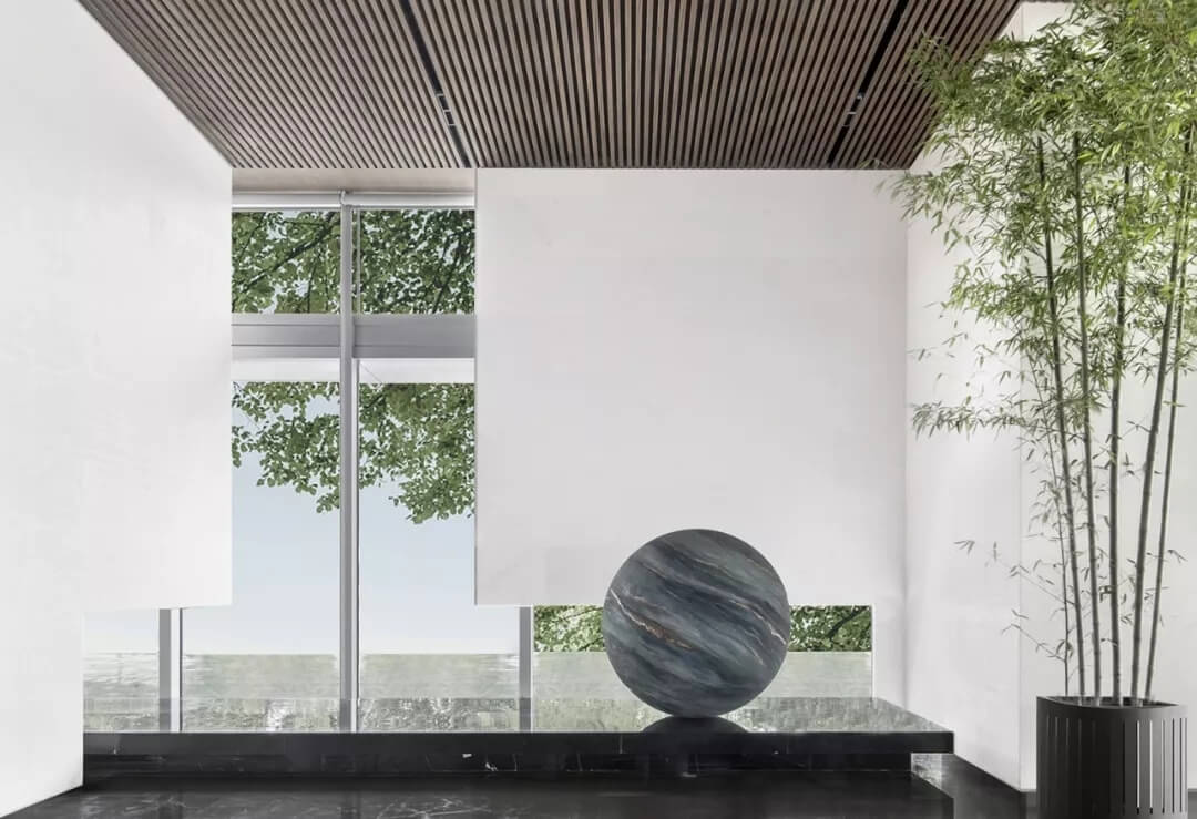 進(jìn)入前廳,暗涌波動(dòng)的猶如海洋的紋理型球狀醒目與空間,設(shè)計(jì)師賦予的撞色又猶如浩瀚星空。以玻璃與室外的相隔,營(yíng)造視覺的感覺錯(cuò)覺,仿若一體的空間綿延。