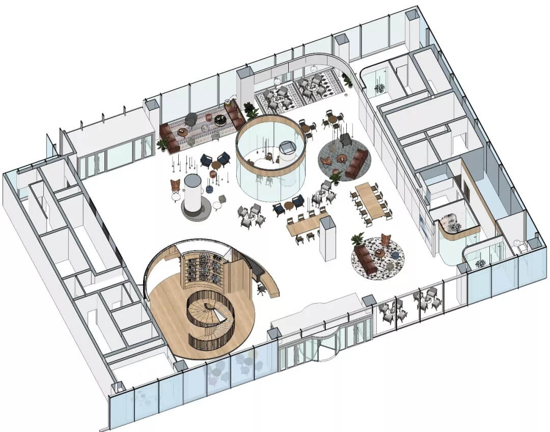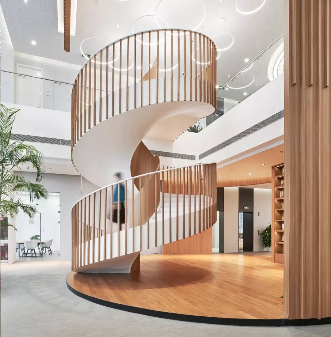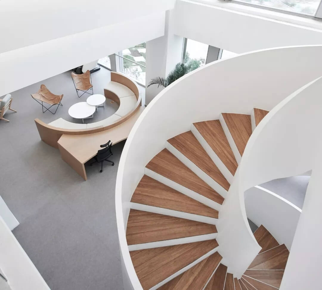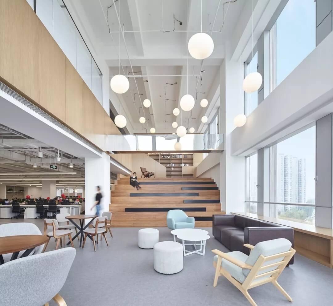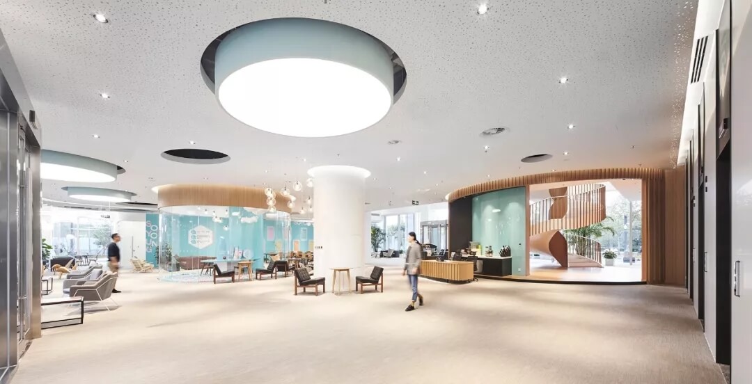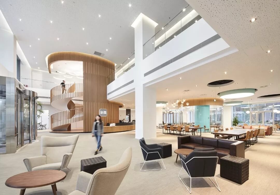 都市客廳島,選擇流暢線條的螺旋樓梯貫穿上下,運(yùn)用條形面板錯(cuò)縫排列成弧形的照明方式,使整個(gè)空間照度均勻,且條形面板亦可作為裝飾展示面。家居軟裝選用極簡(jiǎn)風(fēng)格,流線組擺方式,營(yíng)造自由靈活的空間,促進(jìn)員工間的交流和溝通。