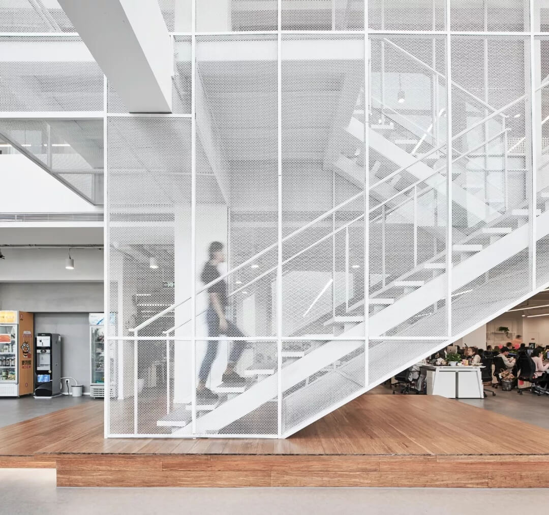 云端漫步主題島樓層公共空間設(shè)置了木質(zhì)的懸掛BOX,用白色的鋼網(wǎng)樓梯連接,樸素和輕盈通透形成鮮明的對(duì)比,如云端漫步,自然中蘊(yùn)含天馬行空,打開(kāi)員工的創(chuàng)意想象。