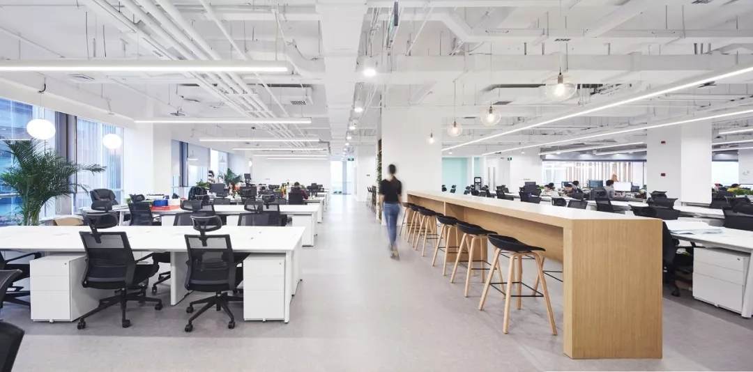 設(shè)計(jì)師在開(kāi)放式的辦公區(qū)域設(shè)置長(zhǎng)條吧臺(tái)桌,供員工自由討論辦公,午間用餐等,同時(shí)開(kāi)放辦公區(qū)與南側(cè)公共島空間相連,員工可攜帶筆記本在這里沐浴著陽(yáng)光辦公,討論,商務(wù)洽談,休憩等。