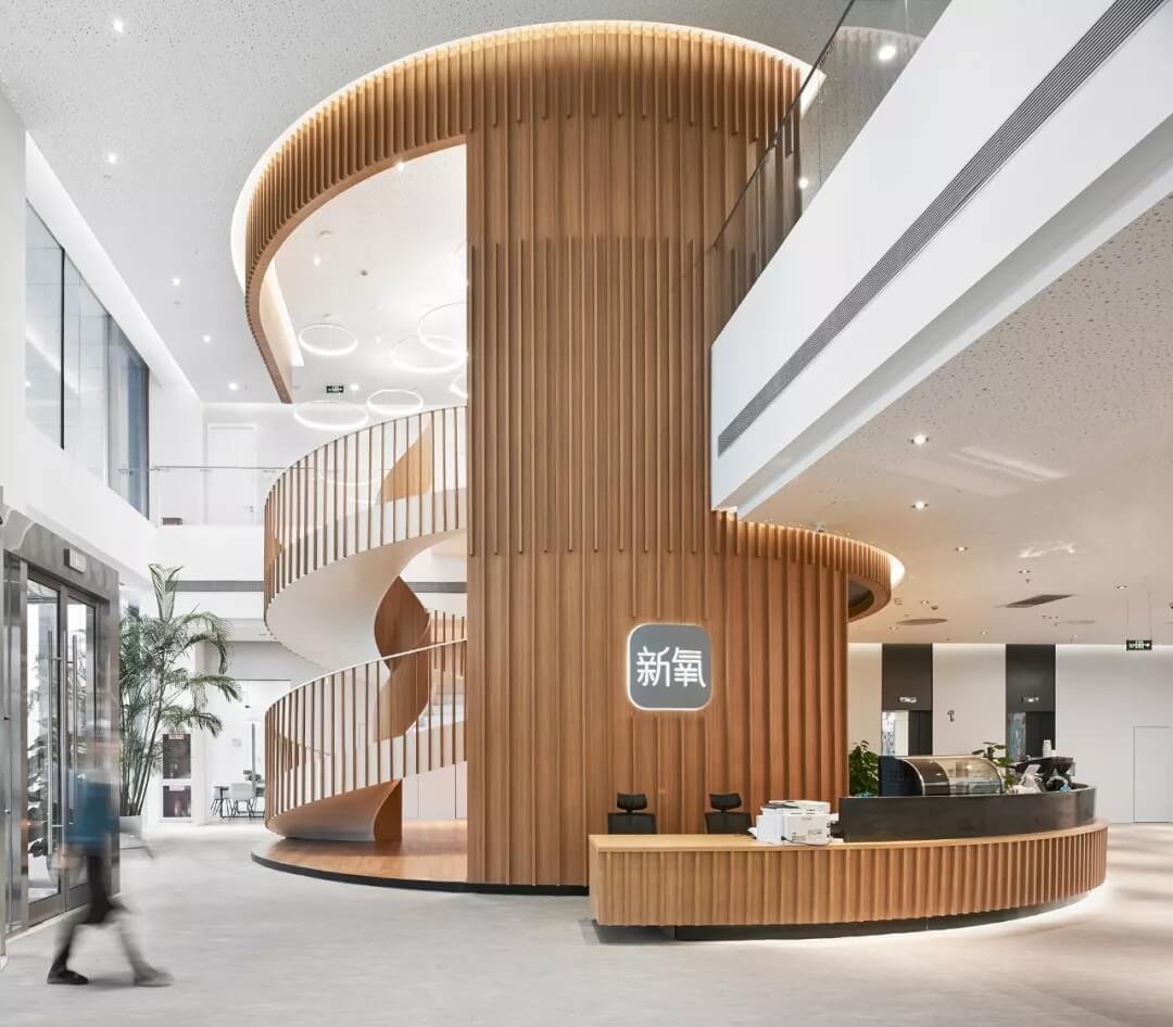 美麗生活館中最矚目的是兩個(gè)圓柱體空間模塊,一個(gè)是貫穿1-2層的木格柵旋轉(zhuǎn)樓梯,半開(kāi)半包,與咖啡館及接待臺(tái)合嵌為一體,溫馨,時(shí)尚,樓梯的內(nèi)側(cè)展示新氧的榮譽(yù)勛章;一個(gè)是透明的柱狀空間,以靜態(tài)裝置的方式展示新氧文化,周圍布置洽談交流座椅;大堂南側(cè)用文化墻隔出開(kāi)放的休閑洽談區(qū)和面試及收發(fā)室的圍合空間。