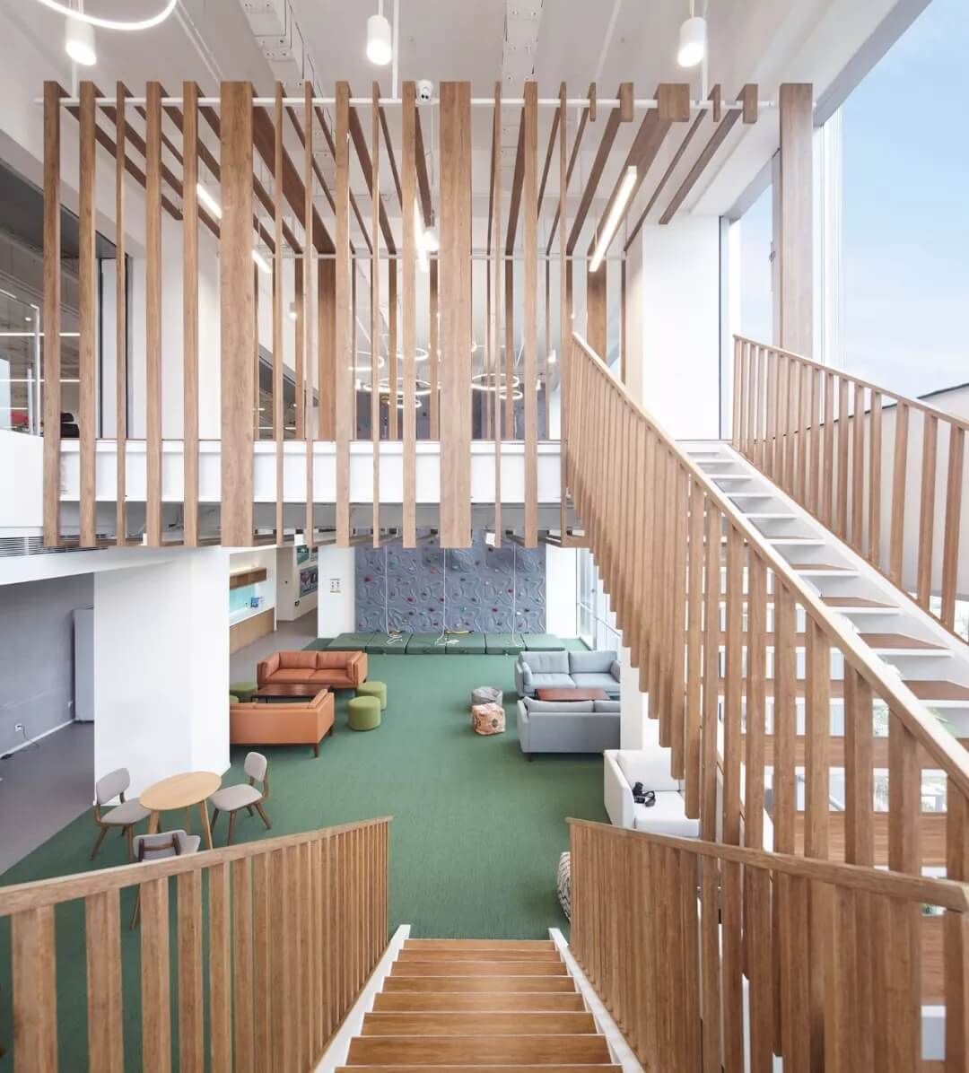 綠籬奇跡島,是自然,健康運(yùn)動(dòng),挑戰(zhàn)自我的主題公共空間。木質(zhì)格柵樓梯在二層延伸出一個(gè)通透的格柵BOX,形成豐富的空間層次和視覺(jué)高差。同時(shí)設(shè)置攀巖墻,瑜伽室和健身房,展現(xiàn)新氧人不懼挑戰(zhàn),運(yùn)動(dòng)健康的生活方式。
