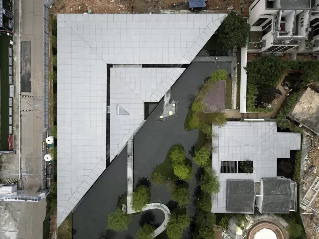同時,整個建筑運用了現(xiàn)代構圖的方式,突破了傳統(tǒng)對稱的客家建筑特征,將多個同心半圓演化成多個相似三角形,構成了不對稱的幾何空間;巧妙地通過線與面的緩急對比加強了視覺上的層次感,以不同的設計手法,在保持建筑與外部交匯貫通的關系的同時,強化了建筑的縱深感。