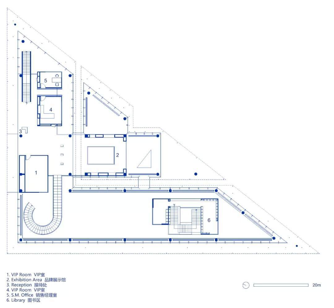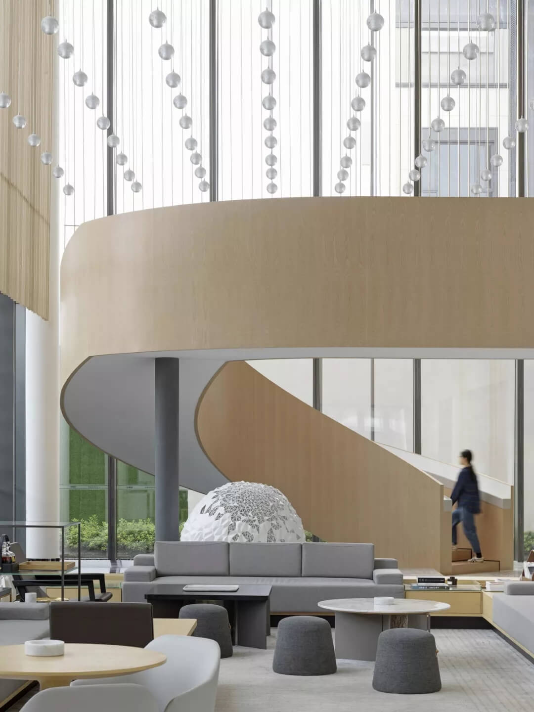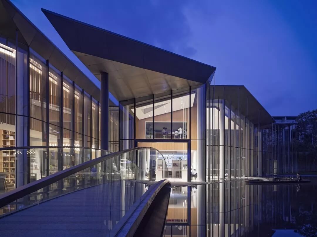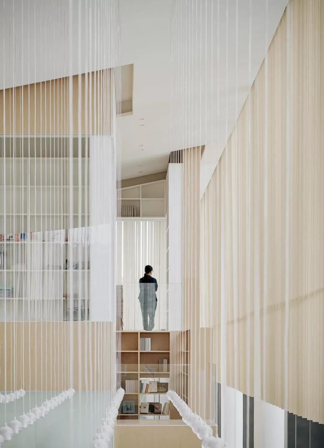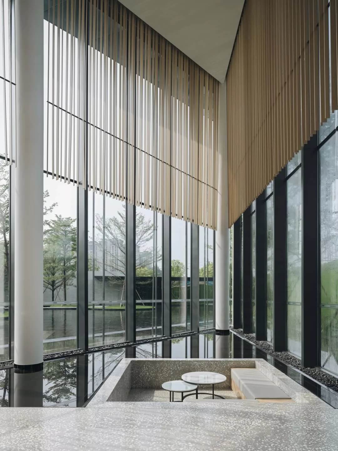 懸挑的頂棚引導游客進入建筑內(nèi)部,映入眼簾的是錯落分布著木質(zhì)懸浮盒子的雙層十米挑高空間。同時大面積的玻璃幕墻營造的通透感,使得無論哪個方位,都具有內(nèi)外空間相通的視覺體驗。隱藏在水池中的下沉休息區(qū),懸掛在天花上的木隔柵,穿插在旋轉(zhuǎn)樓梯和書架之間的休閑洽談區(qū),還有較為隱蔽私密的二層貴賓室,多個不同功能的空間仿佛彼此獨立,卻又渾然一體。