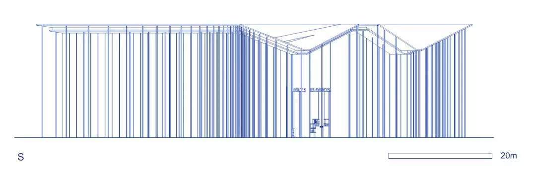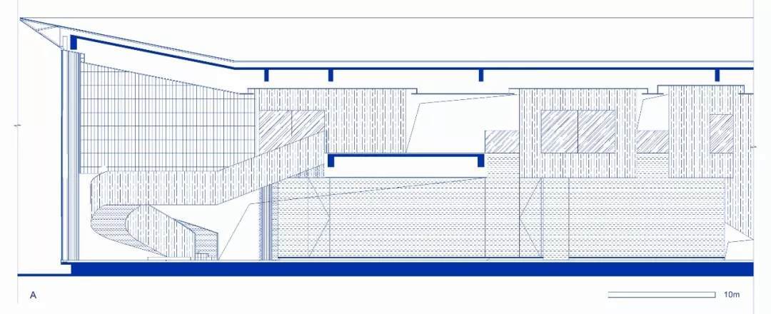 為了適應當?shù)貧夂?,建筑師在南翼雙層通高的開敞空間內(nèi)設置了懸垂的木隔柵,可以達到舒適的遮陽效果,并且具有空間劃分的功能。公共洽談區(qū),雙層書架,咖啡吧就位于此。平行垂落且錯落的木隔柵打破了安靜的空間氛圍,和室外的廊柱相互呼應的同時,密布的木隔柵也自身形成體量與二層的功能體塊虛實相生。