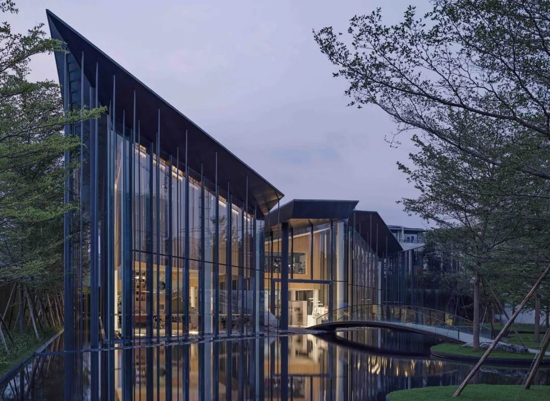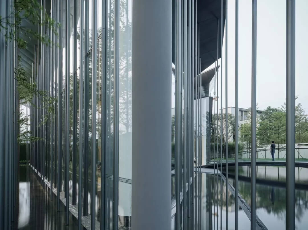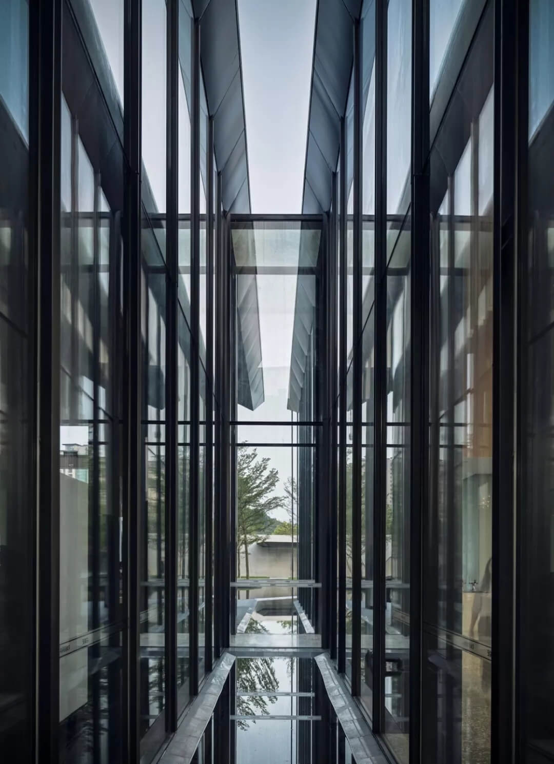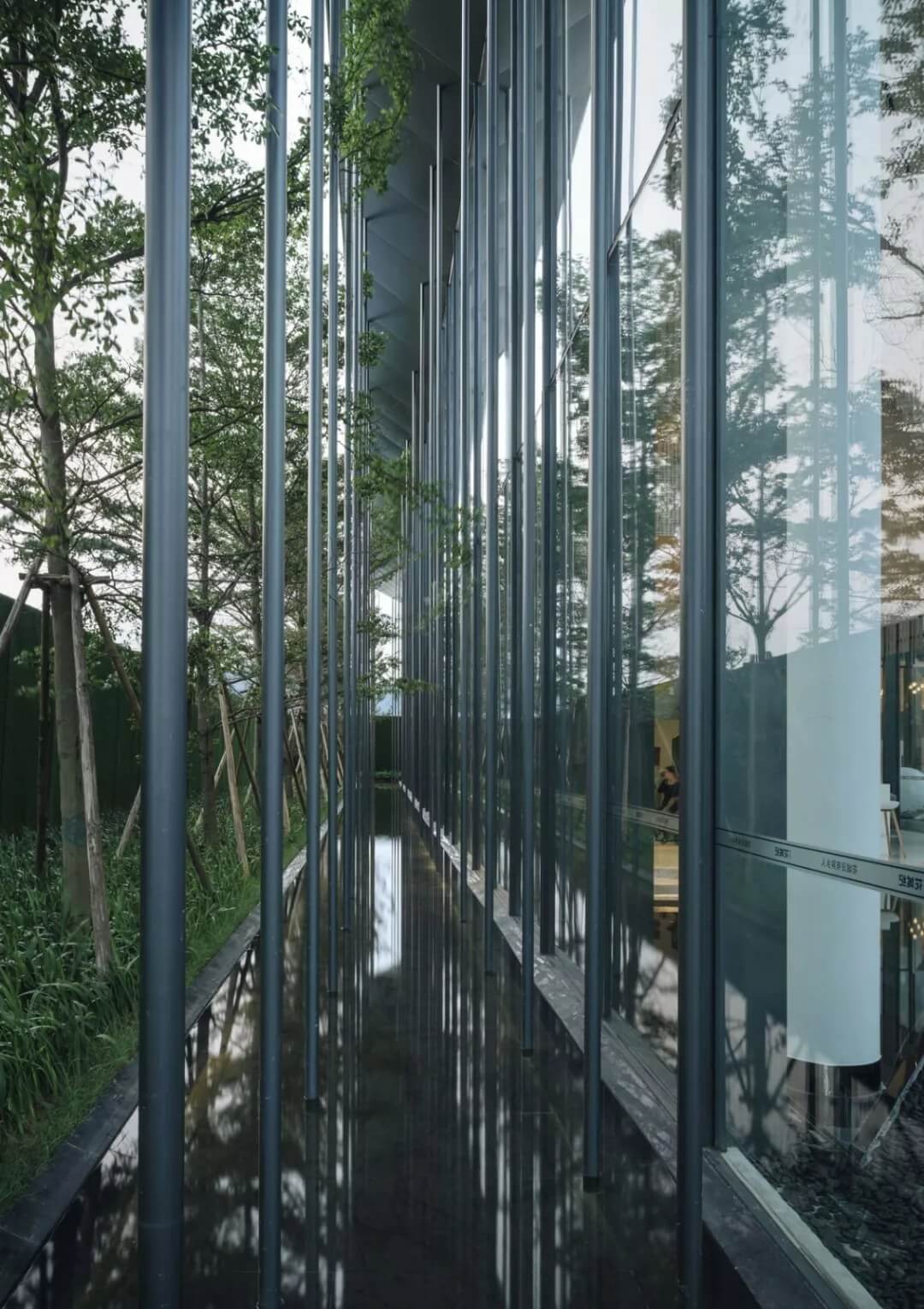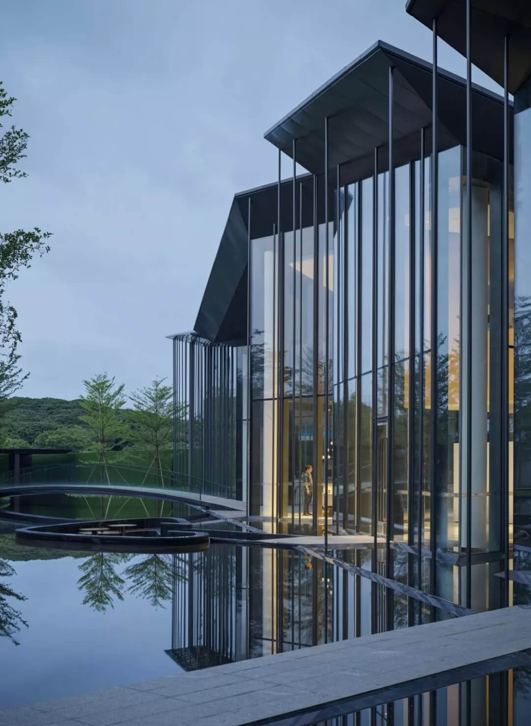 在這個項目中,建筑師嘗試用現(xiàn)代的理念、結構和材料來打造由封閉走向開放融合的客家建筑,創(chuàng)造出傳統(tǒng)文化和現(xiàn)代觀念相結合的建筑形態(tài)。如同客家建筑大多坐落于山水樹林間,這座雙層建筑與周圍自然景觀也保持著親密聯(lián)系。剪影式的三角形頂棚如同山的影子般遮蓋著地面;而支撐著整個三角屋頂?shù)慕饘僦韧鹑裘艿臉淞?,與戶外的樹木連成一片;環(huán)繞場地的水景弱化了由剛性的幾何平面帶來的疏離感,大面積的玻璃的應用,引入周圍綠色景觀,重新定義了建筑與周邊的環(huán)境關系。莊重但不厚重的頂棚,高聳錯落的柱廊,通透的落地玻璃,山與樹與水。