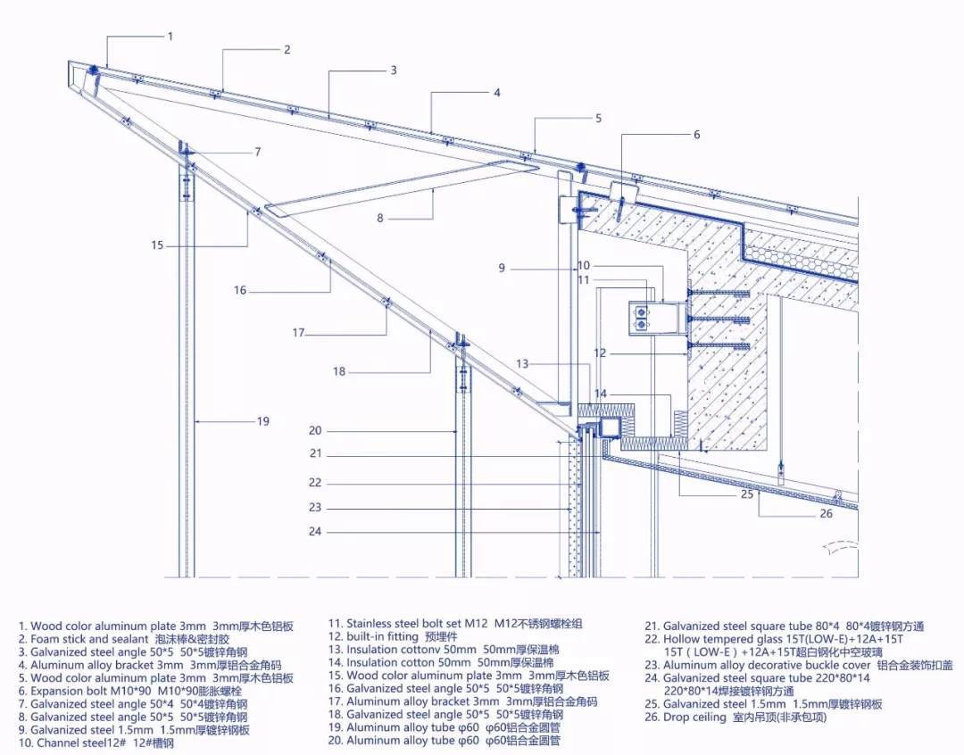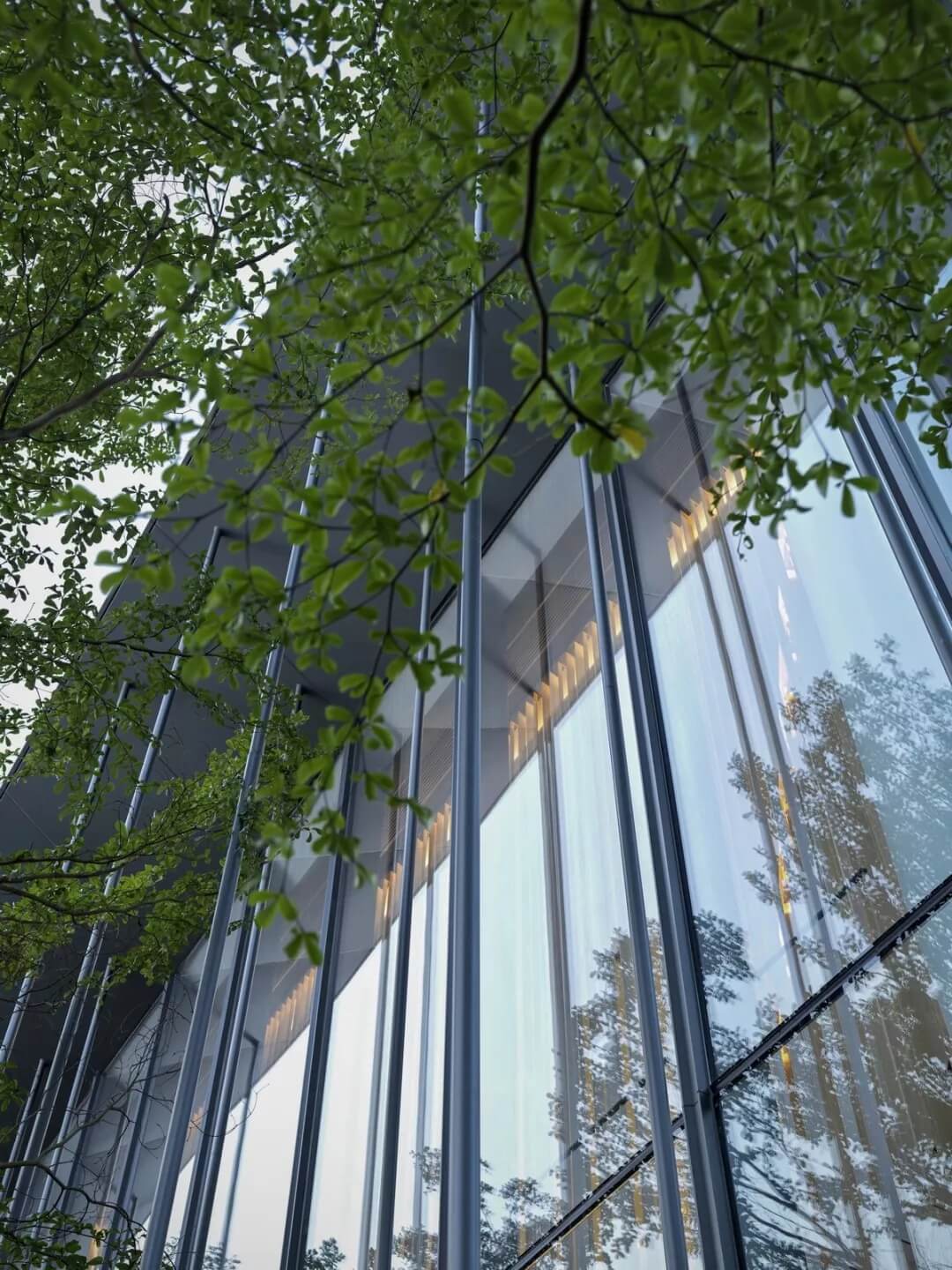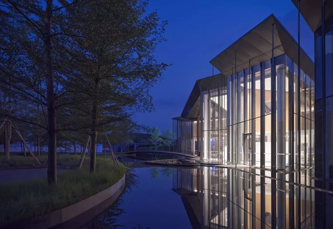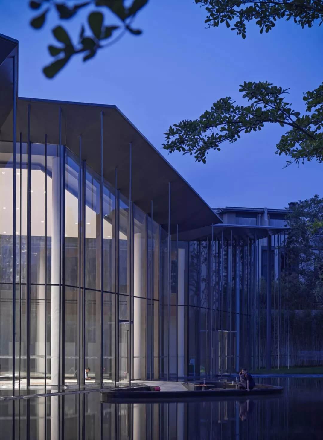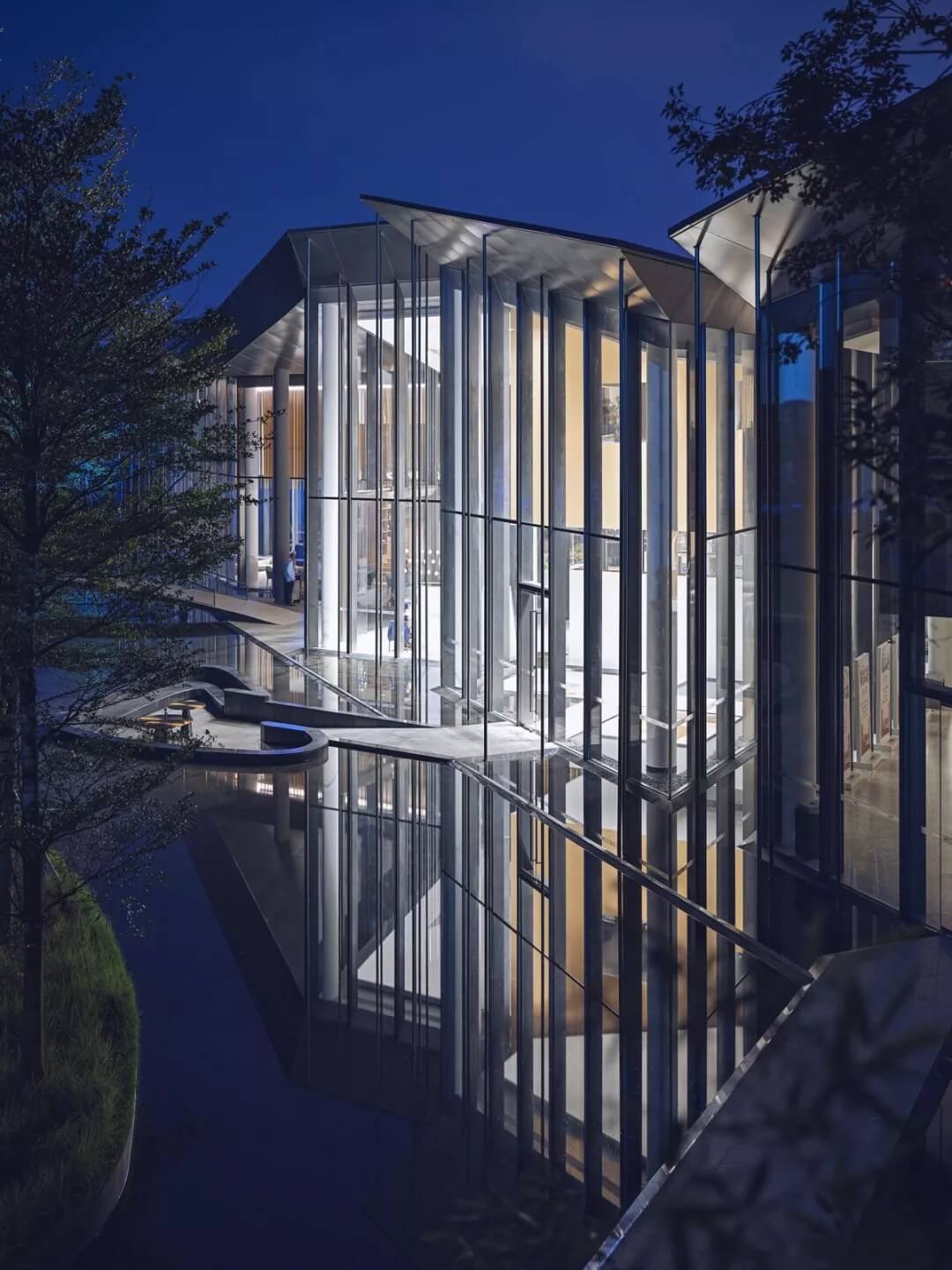 在這個項目中,建筑師嘗試用現(xiàn)代的理念、結構和材料來打造由封閉走向開放融合的客家建筑,創(chuàng)造出傳統(tǒng)文化和現(xiàn)代觀念相結合的建筑形態(tài)。如同客家建筑大多坐落于山水樹林間,這座雙層建筑與周圍自然景觀也保持著親密聯(lián)系。剪影式的三角形頂棚如同山的影子般遮蓋著地面;而支撐著整個三角屋頂?shù)慕饘僦韧鹑裘艿臉淞?,與戶外的樹木連成一片;環(huán)繞場地的水景弱化了由剛性的幾何平面帶來的疏離感,大面積的玻璃的應用,引入周圍綠色景觀,重新定義了建筑與周邊的環(huán)境關系。莊重但不厚重的頂棚,高聳錯落的柱廊,通透的落地玻璃,山與樹與水。