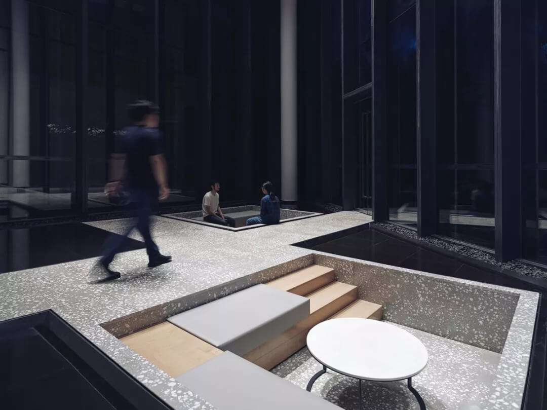 下沉式休息區(qū)由外部滲透進來的水體環(huán)繞包圍,似客家建筑中的天井,收集儲蓄疏通雨水,淺水鏡面不僅倒映出光影的變化,也將窗外的枝繁葉茂引入室內(nèi),營造出人與自然融于一體的環(huán)境。