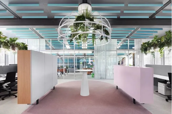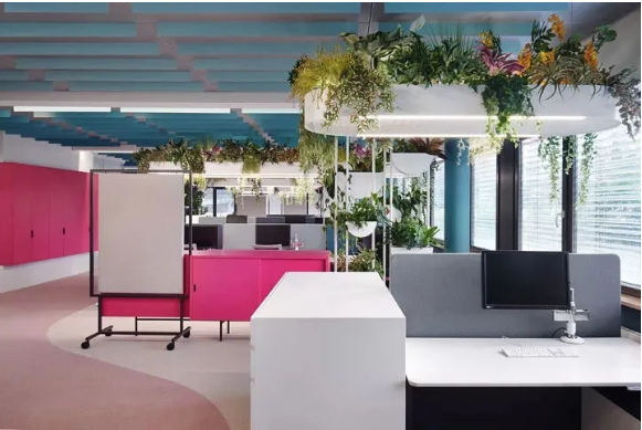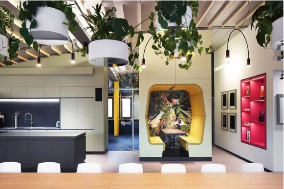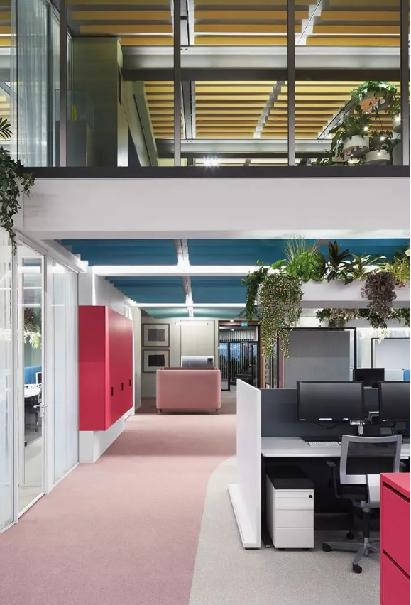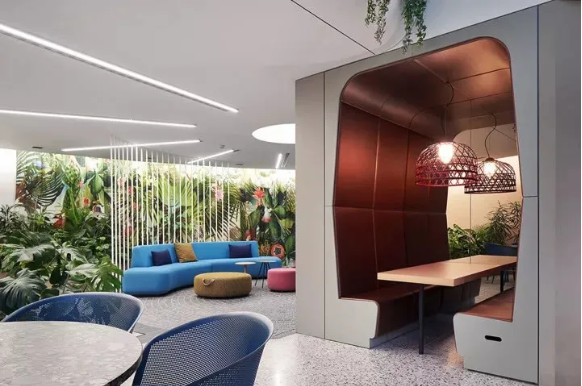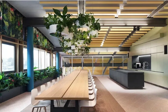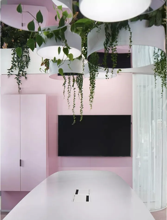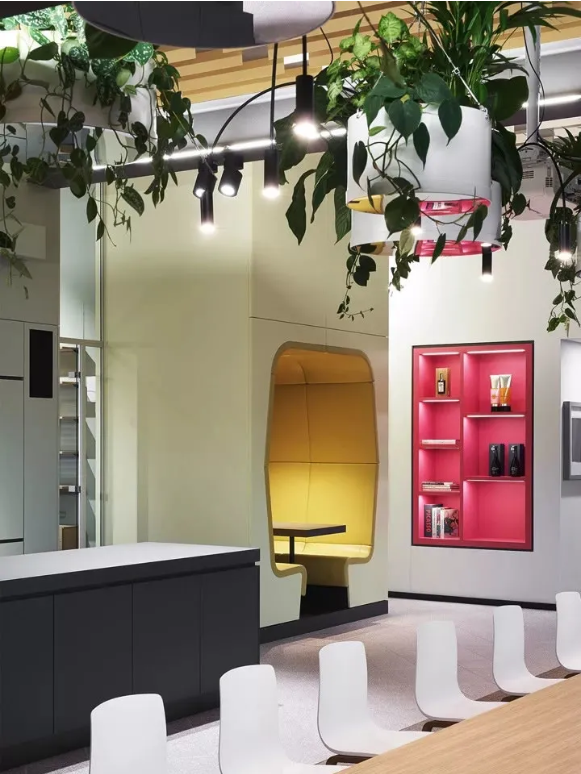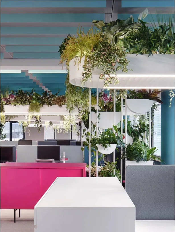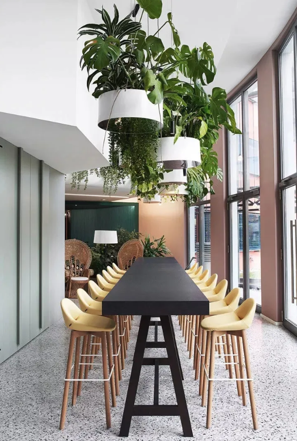 首先,設計團隊為這處工作場所增添了2100個超級盆栽植物。綠植能產(chǎn)生良好的情緒、降低精神壓力、促進創(chuàng)新、提高績效。此外,綠植還能改善空氣質量、營造健康環(huán)境,并起到降噪的作用。它們只需定期澆水就能保持茂盛狀態(tài),因此深得人心。室內(nèi)盆栽植物具有強大的正能量。自從加入了這些綠化,室內(nèi)濕度不僅從18%增加到44%,讓人們的體感非常舒適,連員工的病假都減少了一半!