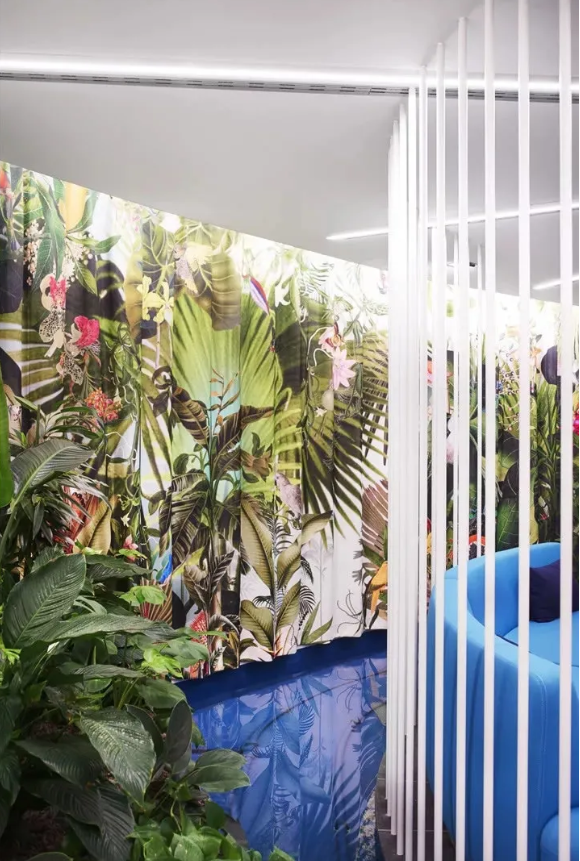 工作區(qū)采用中性色設計,利于專注工作。淡粉色的走道是真正的情緒助推器,它喚起了員工之間的情感共鳴。精心布置的水源和雅致的燈光設計有助于帶來更愉悅的心情。熱帶壁紙與柔軟的沙發(fā)和小圓桌塑造了一個熱情洋溢的活力氛圍。