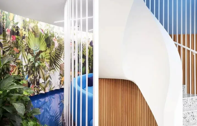 在這個項目中,一個令人著迷的挑戰(zhàn)是在不干擾現(xiàn)有結構的情況下徹底改造建筑物。設計團隊通過改變天花景觀來塑造一個完全不同的場景氛圍。在原有天花板的下面增加彩色條板裝飾。漸變的彩色條板取代了原來的灰色金屬天花板,不僅創(chuàng)建了空間的進深感、也讓身心感覺舒適。藍色,是一種讓人寧靜的色彩,同時能夠促進創(chuàng)造力。藍色向白色的漸變,增添了空間的開放感和輕盈感。