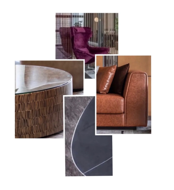 單椅大量使用皮革凸顯質(zhì)感,同時(shí)在家具上通過(guò)黑鋼、木及玻璃等打造硬朗穩(wěn)重的商務(wù)格調(diào)。