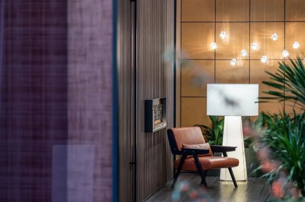 前廳一角,一把隨意的休閑椅構(gòu)設(shè)出安靜而獨(dú)立的等候區(qū)。光是一味奇妙而誘惑的催化劑,見證格柵的參差錯(cuò)落,旖旎于水滴狀通透吊燈,如同午夜巴黎那一杯令人情迷的威士忌,透過(guò)光影的變幻,實(shí)現(xiàn)精尚定調(diào)。