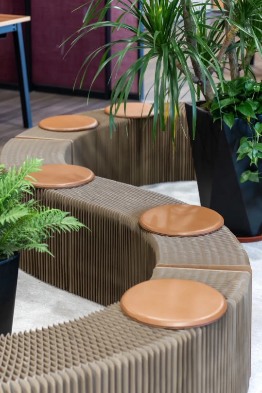 裝置互動(dòng)區(qū),采用s型手風(fēng)琴形態(tài)展示,可伸縮挪動(dòng),搭建起多人會(huì)客溝通的場(chǎng)景,在曲折回旋中梳理人文互動(dòng)的脈絡(luò)。從初始到終結(jié),代表五行木文化的綠植一前一后,維系場(chǎng)域間的平衡與沉穩(wěn)。