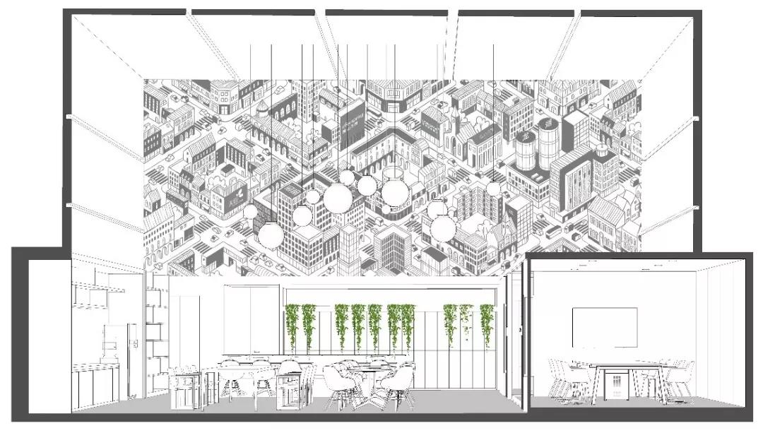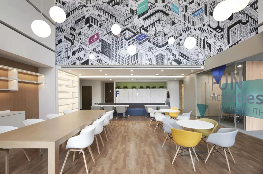 南側(cè)挑高區(qū)的空間定義為“城市客廳”,視覺(jué)感受區(qū)別于北區(qū)的咖啡主題,更加明快現(xiàn)代,為整個(gè)辦公區(qū)帶來(lái)時(shí)尚、活躍、靈動(dòng)的感受。“活力城市”的軸側(cè)插畫(huà)裝點(diǎn)了整個(gè)挑高區(qū)二層墻面,龍湖重點(diǎn)產(chǎn)品的標(biāo)識(shí)隱含其中,傳達(dá)出龍湖精彩紛呈的產(chǎn)品類(lèi)型和高品質(zhì)特征。