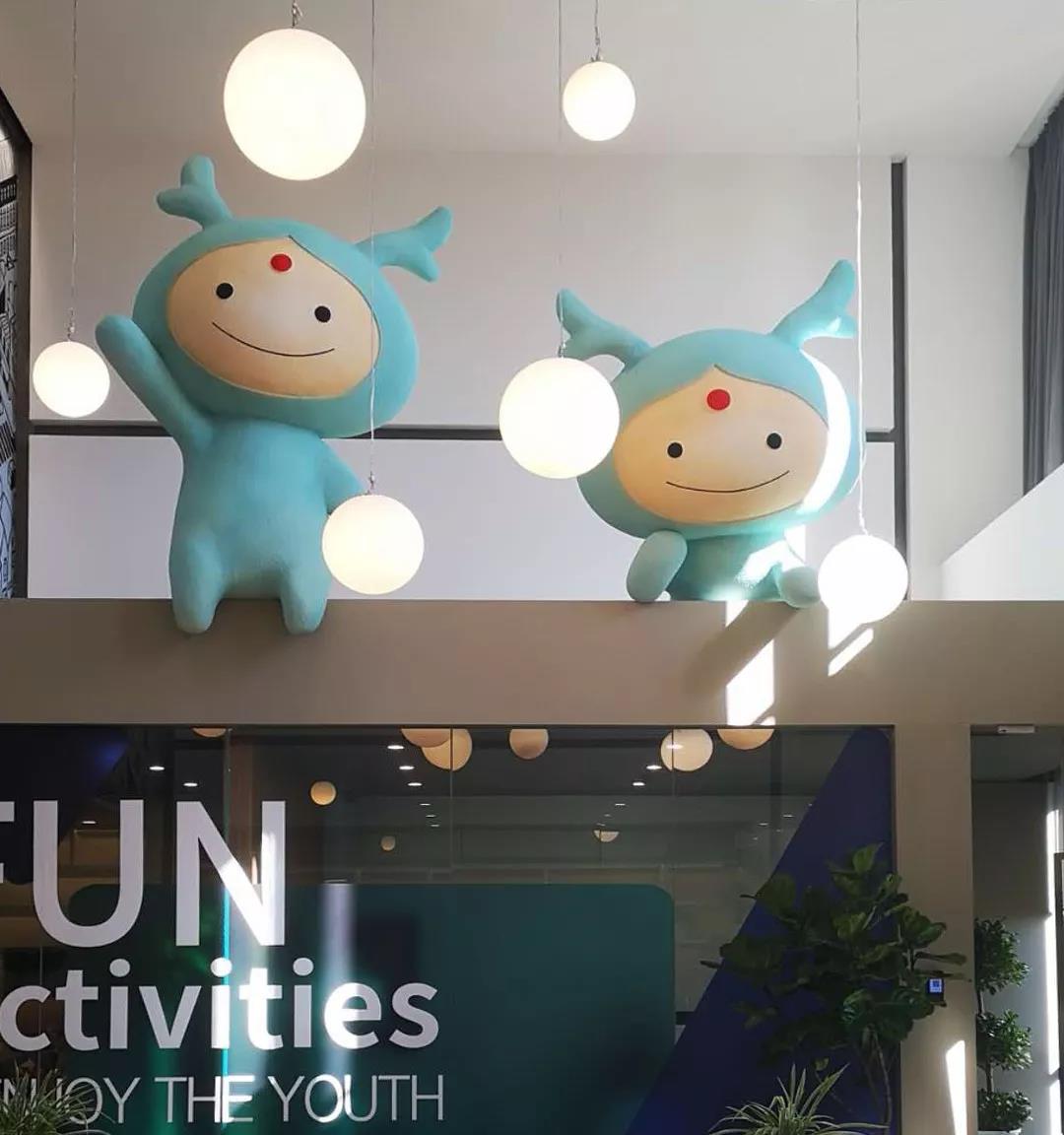 此區(qū)域另外的一個(gè)亮點(diǎn)是在會(huì)議室頂端利用空間設(shè)置了“龍小湖”巨型卡通造型,同此空間的人招手互動(dòng),為空間帶來(lái)了一種親和的童趣。也是傳達(dá)龍湖企業(yè)形象的一處絕佳空間。