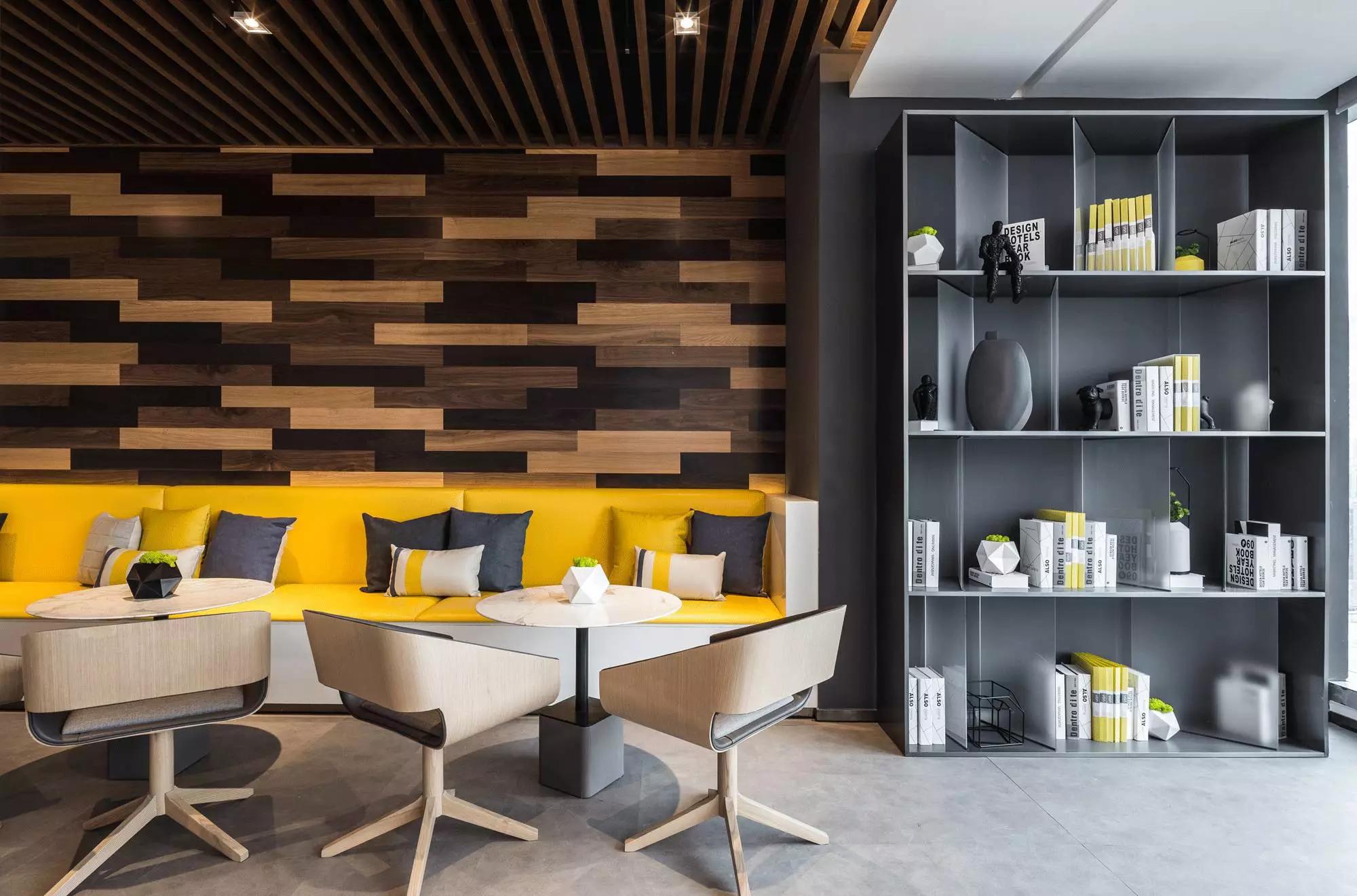 設(shè)計師用藍與灰搭配出冷靜主色調(diào),綴以沙發(fā)的暖意來提亮空間,而背景以深淺原木交錯搭配,設(shè)計流于細節(jié)之中。閑時,或仰臥在沙發(fā)上、在其旁邊的書柜看一會兒閑書,或坐在沙發(fā)上與同事聊聊天、聽一段舒緩的音樂、下一盤棋,小憩之后再投入工作,想必效率也會更高。