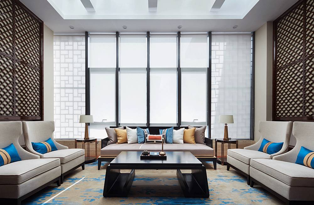沙盤區(qū)采用簡單、大氣的設計手法,沒有濃墨重彩的奢華場景,更多的是將歷史古都的韻味帶到細節(jié)中,如格柵、窗欞、黛青色擺件、意境掛畫等東方元素都透露著古韻,并融入大理石、玻璃、燈帶等現(xiàn)代材料,在營造意境的同時兼顧場所的使用功能。