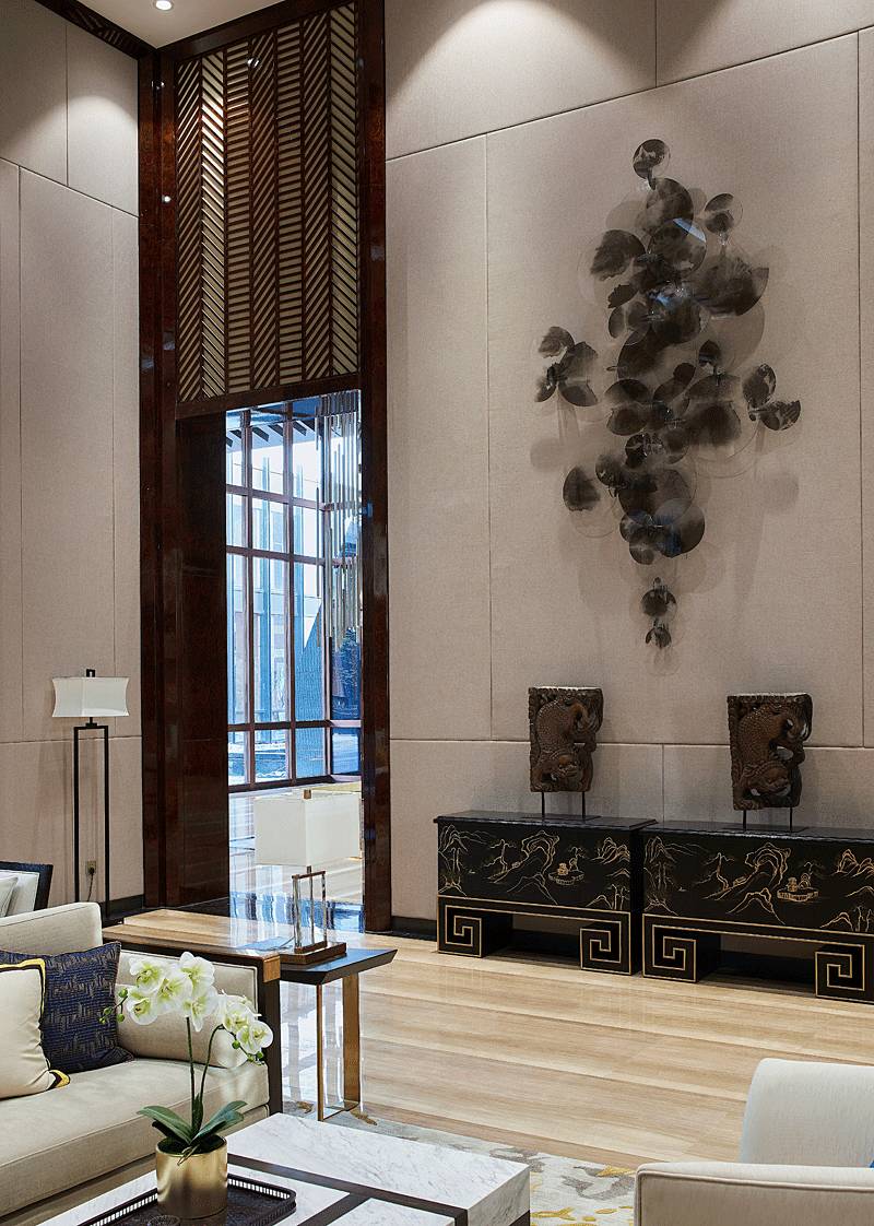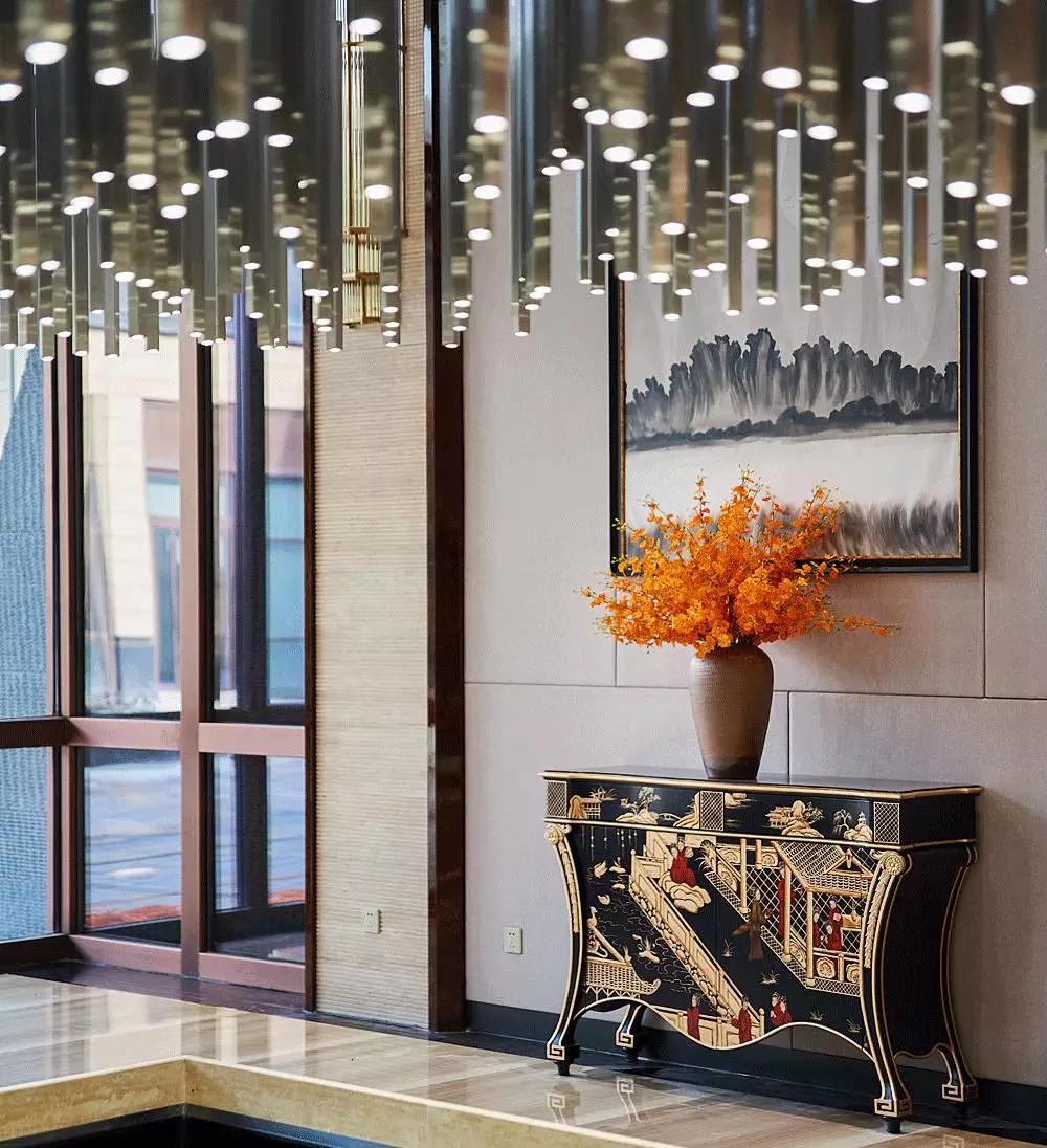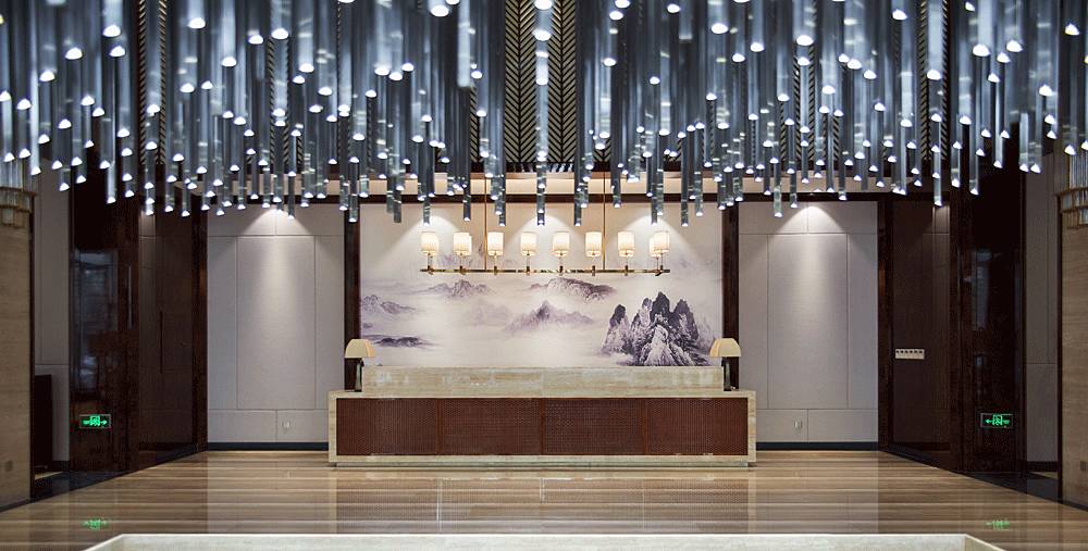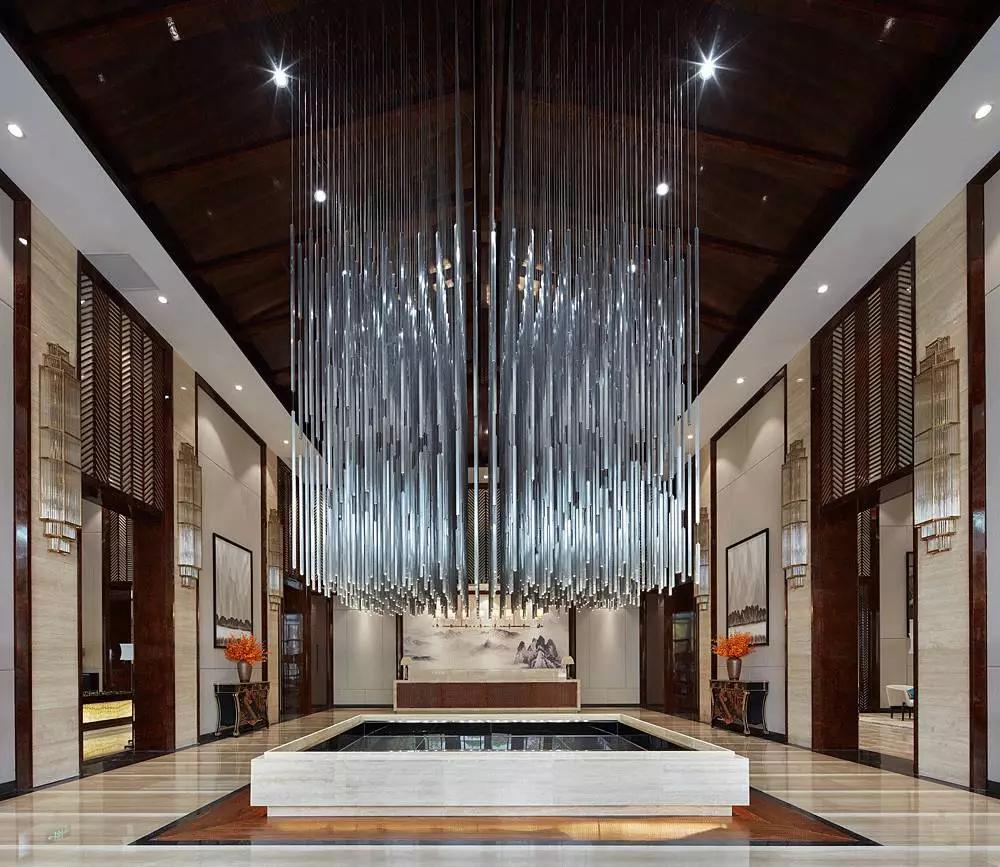 進入大堂中心,便被一個奪人眼目的裝置藝術吸引,數(shù)百根不銹鋼條垂吊而下,宛如瀑布“飛流直下三千尺,疑是銀河落九天”,成為整個空間的視覺焦點,啟動后,水珠從不銹鋼滴落到地景的水中,呈現(xiàn)出“大珠小珠落玉盤”的動感。